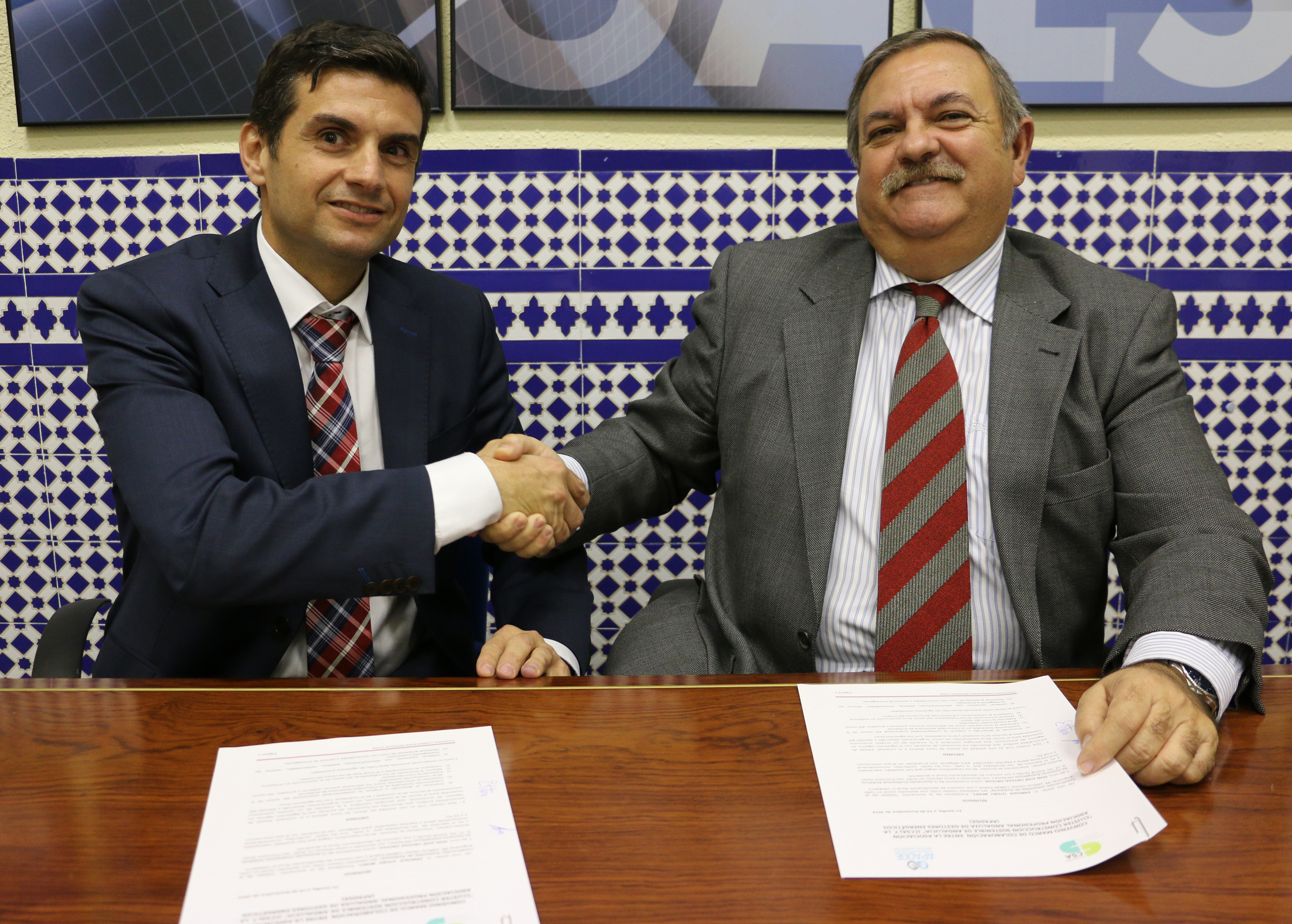 PIE DE FOTO: Enrique Otero, presidente del Cluster de la Construcción Sostenible de Andalucúa; y José Ortega, presidente de APADGE, en la firma del convenio.