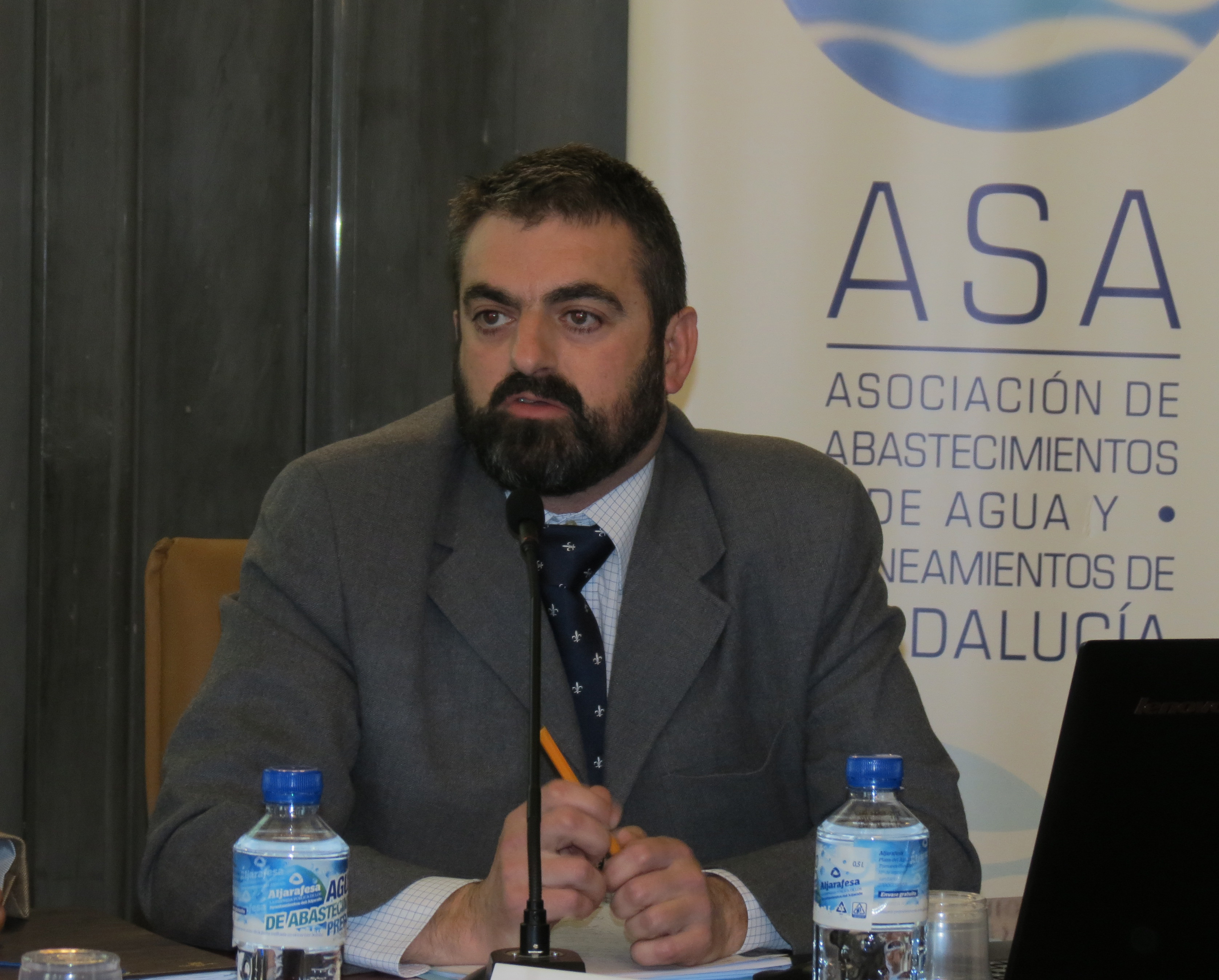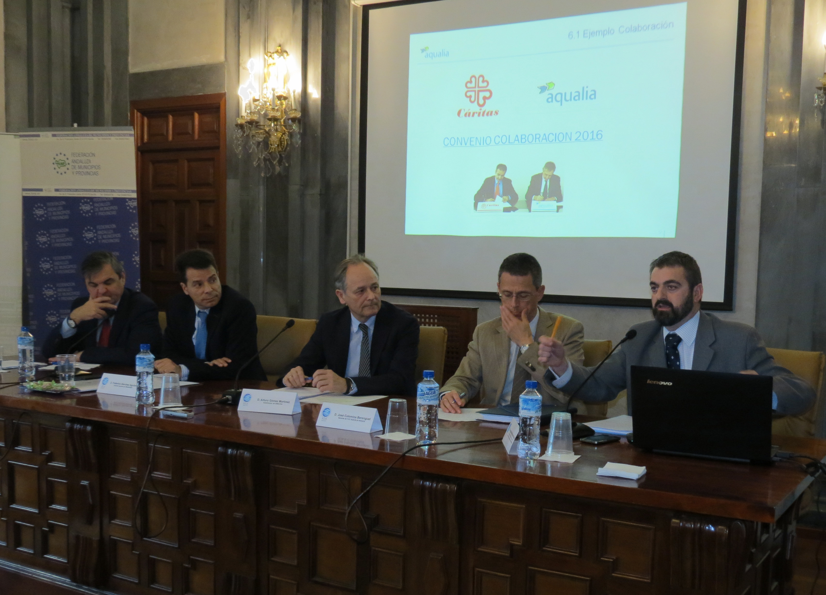 El gerente de Aqualia en Almería, José Colomina Berenguel (a la derecha en la mesa), durante su intervención en la I Jornada “Medidas de Acción Social en el Sector del Agua” (Sevilla).