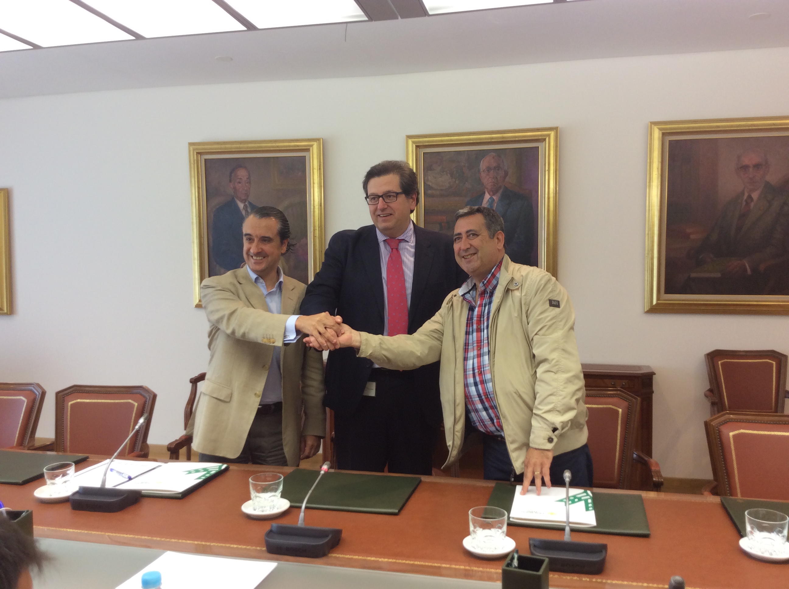 PIE DE FOTO: José Ismael Muñoz Sánchez-Horneros, administrador del Fraile-Llanos de Castillejo S.L; Luis J. García-Lomas Pousibet, subdirector de Caja Rural de Jaén; y Pedro Antonio Melgarejo, administrador único de S.L Aceites Campoliva