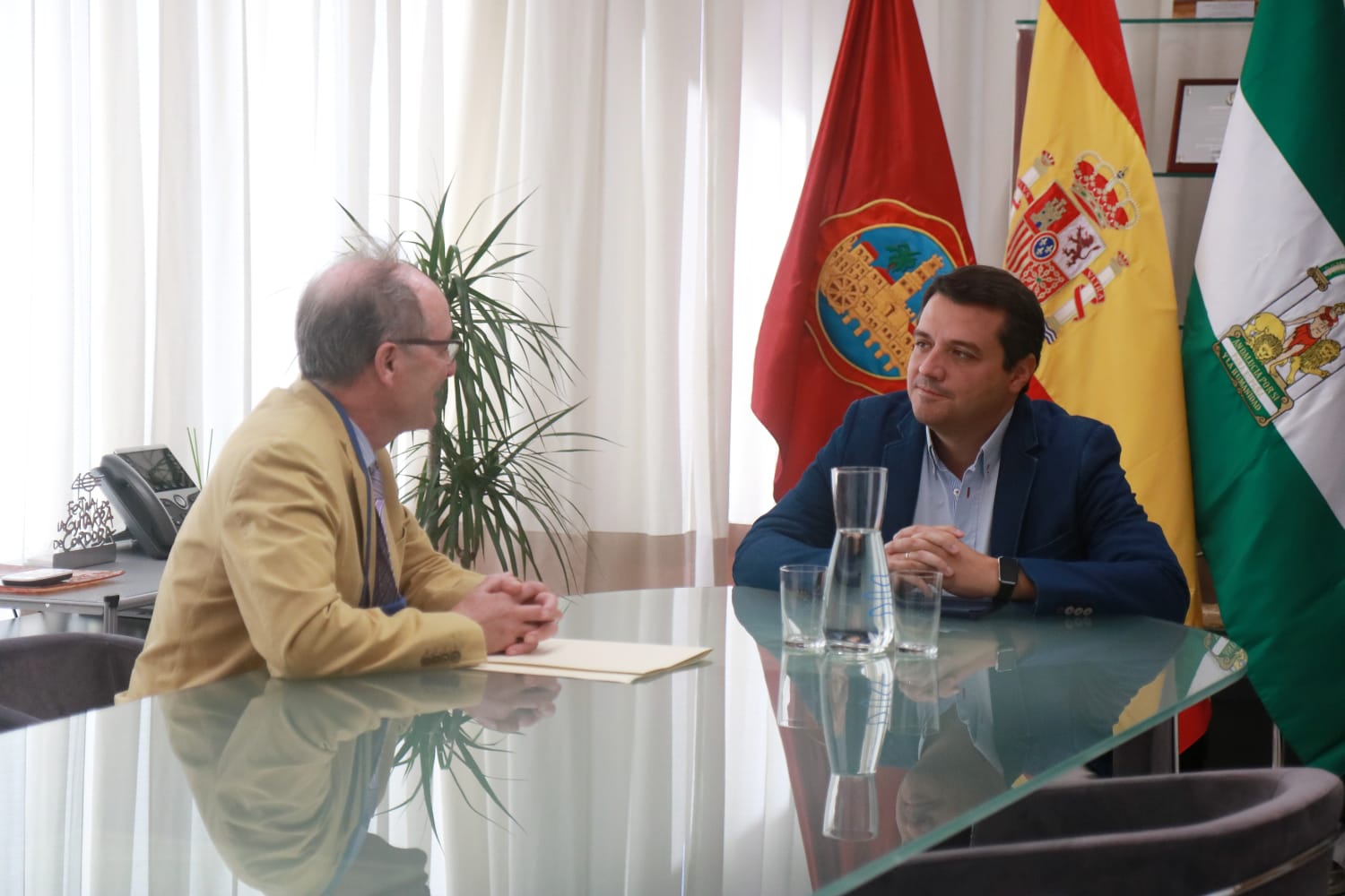 PIE DE FOTO: El Dr. Manuel de la Mata, jefe del Servicio de Digestivo del Hospital Reina Sofía de Córdoba y representante de AEHVE, es atendido por el alcalde de Córdoba, José María Bellido.