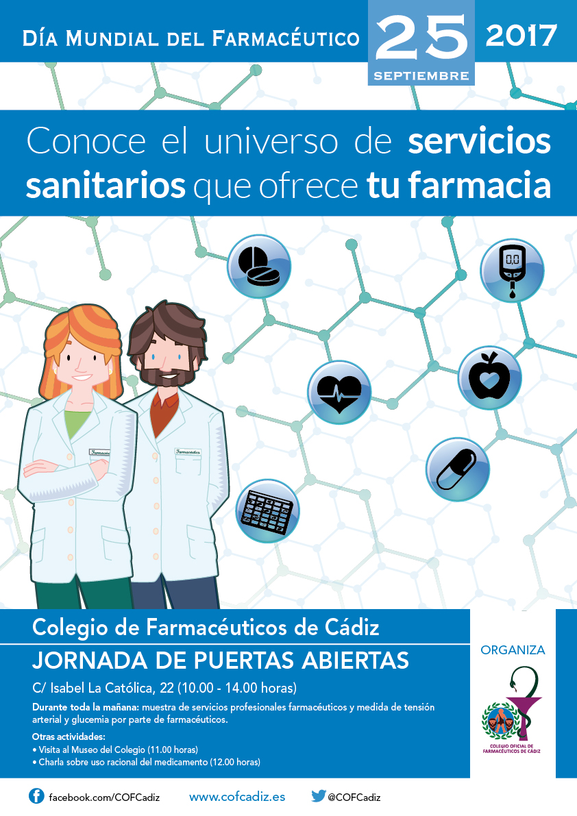 Cádiz, 21 de septiembre de 2017.- El Colegio de Farmacéuticos de Cádiz celebrará el próximo lunes, con motivo del Día Mundial del Farmacéutico, una jornada de puertas abiertas en su sede corporativa (sita en C/ Isabel La Católica, 22, en pleno de centro de la ciudad) que servirá para mostrar el potencial de las oficinas de farmacia gaditanas como espacios de salud, más allá de la habitual dispensación de medicamentos, seña de identidad de la farmacia comunitaria.