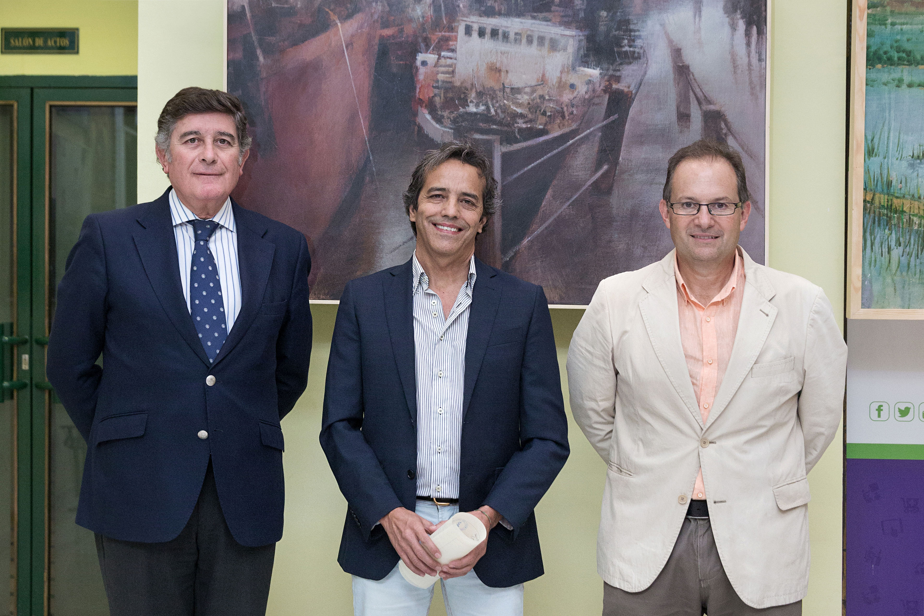 PIE DE FOTO: De izquierda a derecha: Manuel Pérez, presidente del Colegio de Farmacéuticos de Sevilla; Iván Mario Dos Santos, ganador de la 15ª edición del concurso; y Juan Pedro Vaquero, secretario del Colegio, aparecen ante la obra 'Niebla en el puerto', ganadora de esta edición.