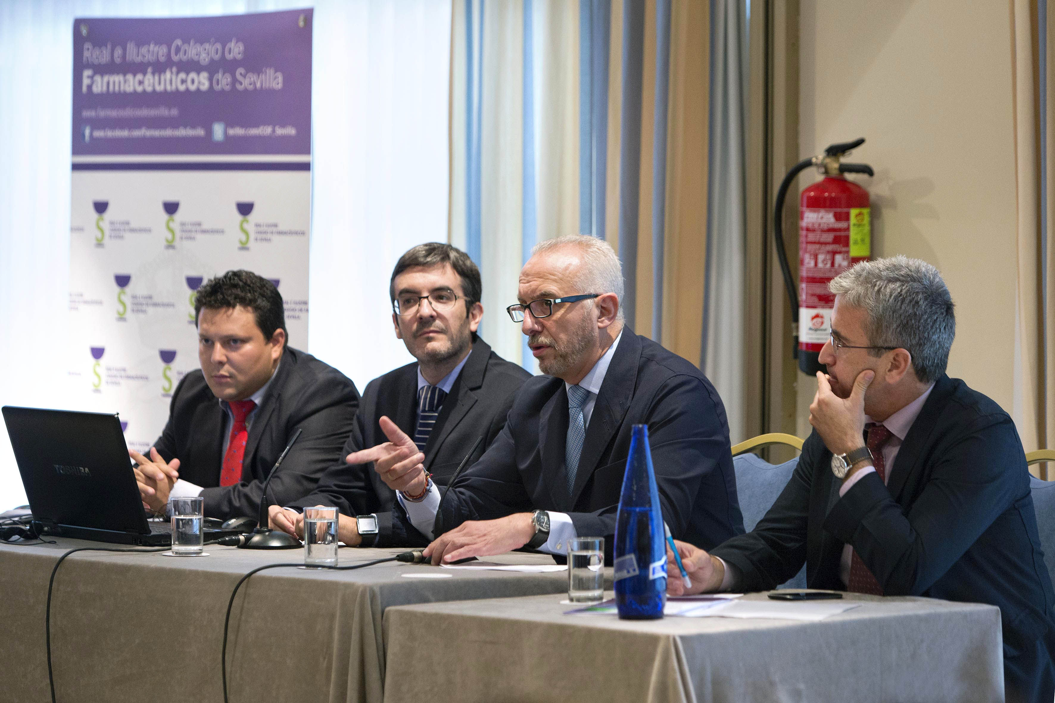 PIE DE FOTO: De izquierda a derecha, Luis Miguel Pérez y Salvador Serrano, de PSN Sercon; Manuel Ojeda y Pedro Bueno, vicepresidente y gerente del Colegio de Farmacéuticos de Sevilla.