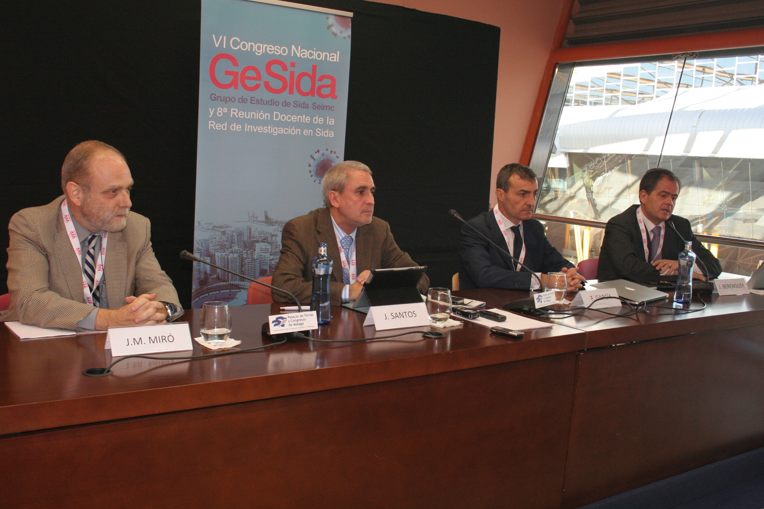PIE DE FOTO: De izquierda a derecha, Dr. José María Miró, presidente de la SEIMC; los doctores Jesús Santos y Federico García, co-presidentes del VI Congreso de GeSIDA; y Dr. Juan Berenguer, presidente de GeSIDA.