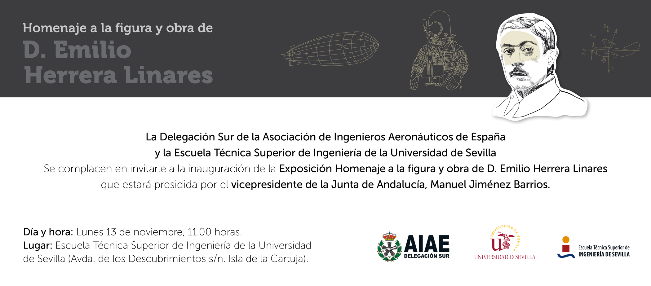 La inauguración de la exposición homenaje a Emilio Herrera Linares tendrá lugar el próximo lunes 13 de noviembre, a las 11.00 horas, en la Escuela Técnica Superior de Ingeniería de Sevilla y que estará presidida por el vicepresidente de la Junta de Andalucía, Manuel Jiménez Barrios.