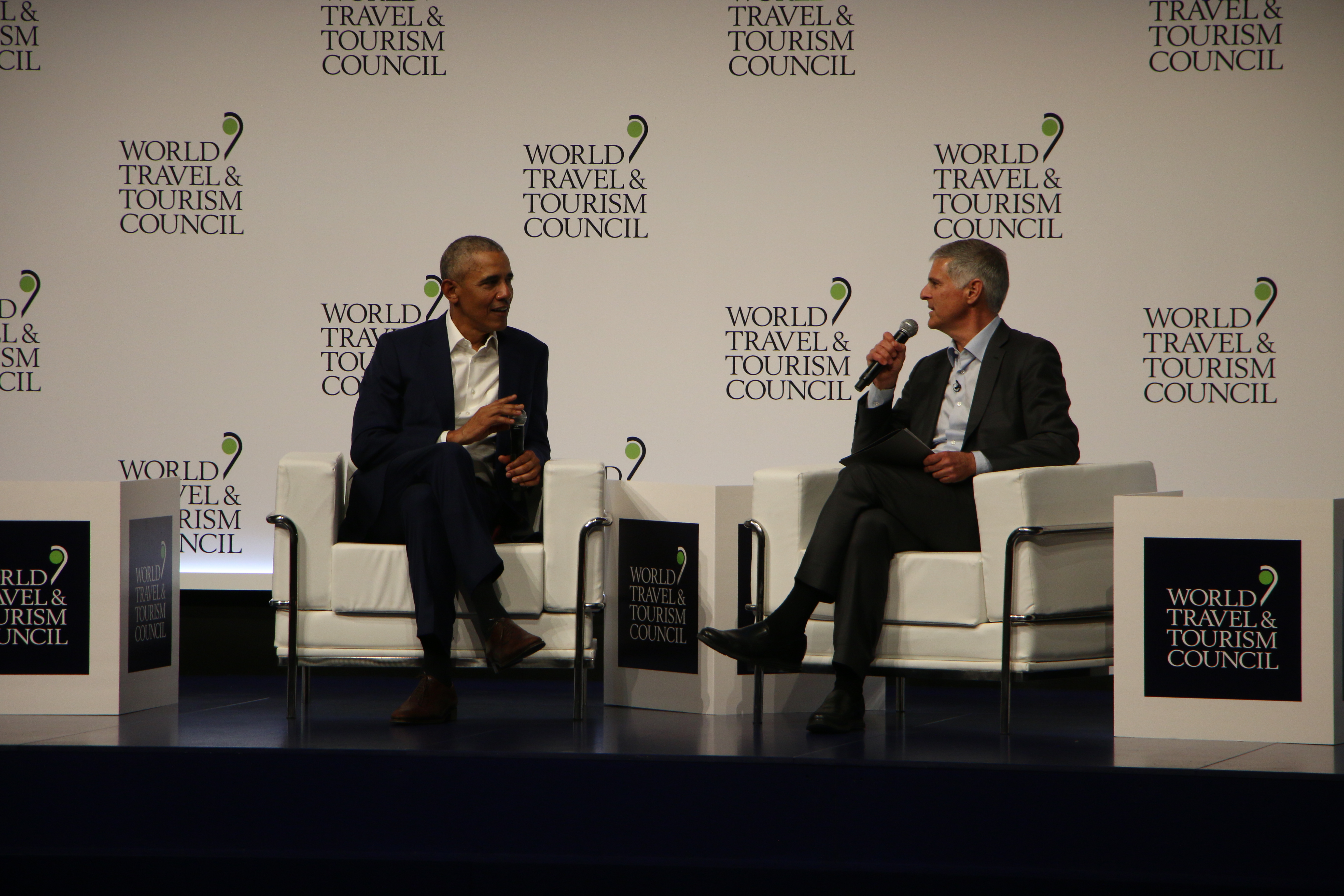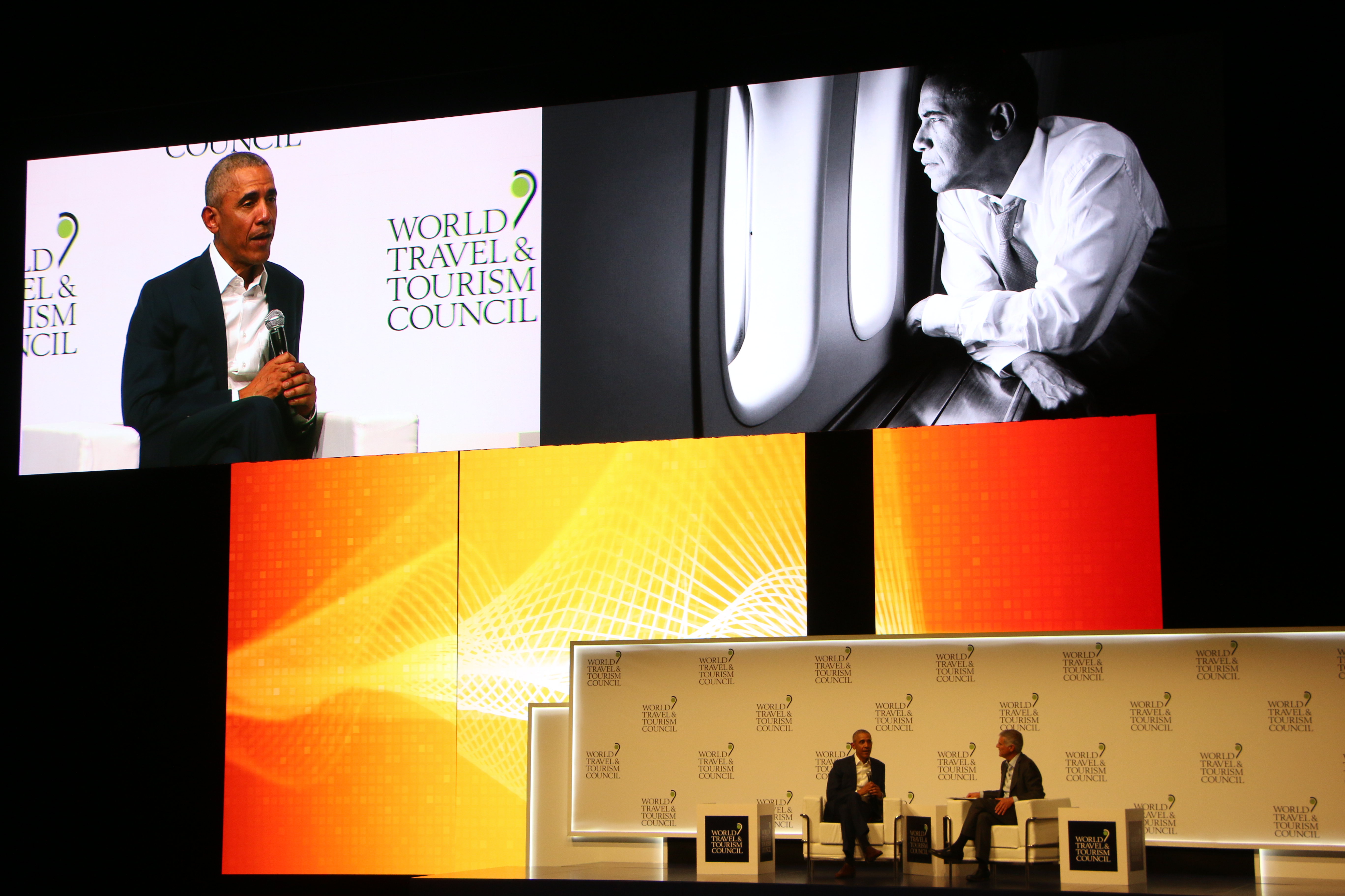 El 44º presidente de EE.UU., Barack Obama, durante su participación en la Cumbre Mundial de Turismo, en el transcurso de su conversación con el presidente de WTTC y CEO del Grupo Hilton, Christopher Nassetta.