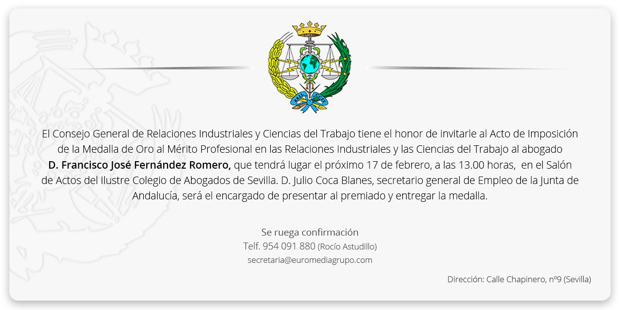 INVITACIÓN 'ACTO DE IMPOSICIÓN DE LA MEDALLA DE ORO AL MÉRITO PROFESIONAL' DEL CONSEJO GENERAL DE RELACIONES INDUSTRIALES Y CIENCIAS DEL TRABAJO A FRANCISCO FERNÁNDEZ ROMERO |