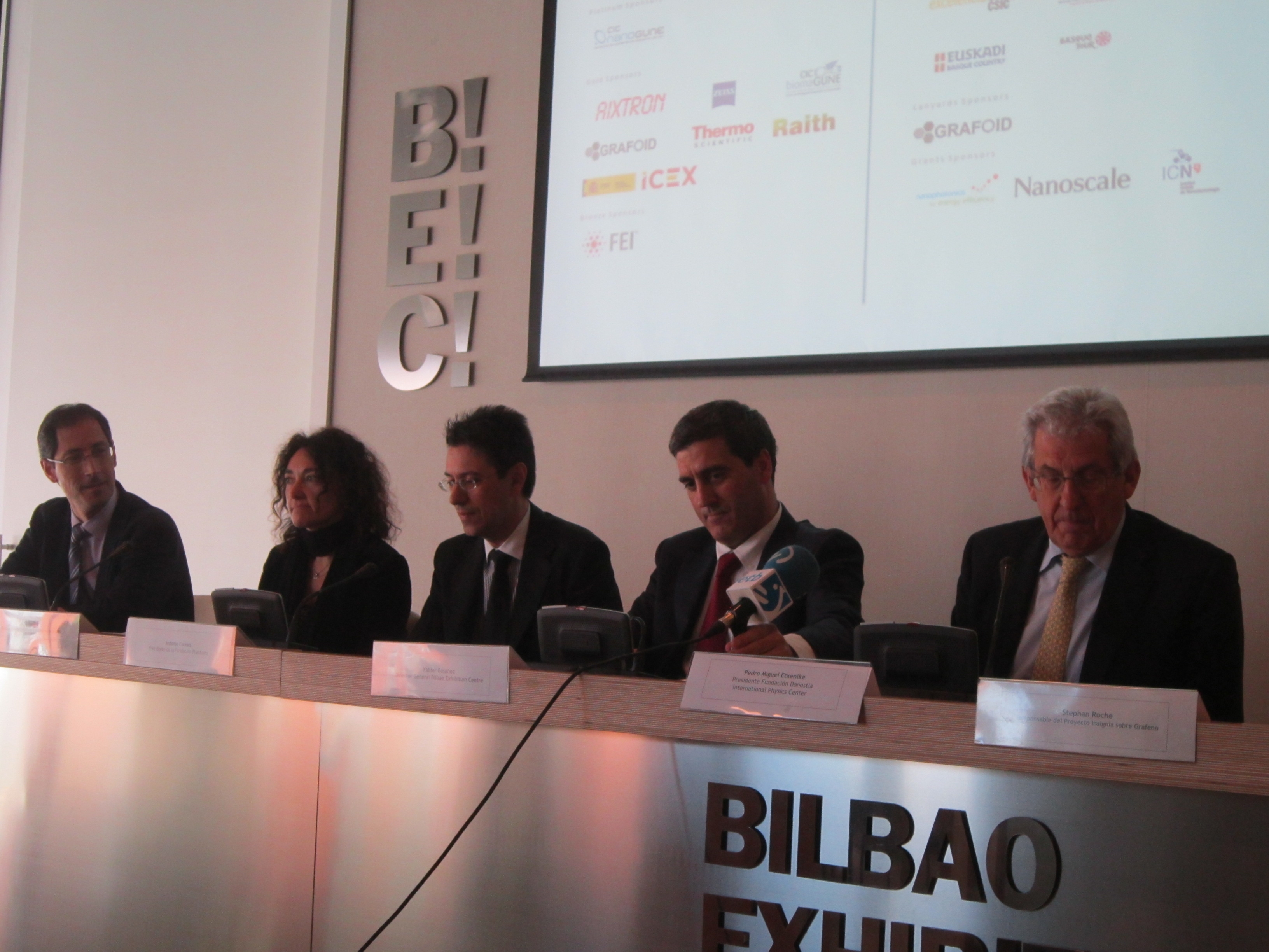 En la presentación de esta gran encuentro sobre nanotecnología han intervenido hoy en rueda de prensa Pedro Miguel Echenique, presidente de la Fundación Donostia International Physics Center y Premio Príncipe de Asturias de Investigación Científica y Técnica; José María Pitarque, director general del CIC nanoGUNE; Antonio Correia, presidente de la Fundación Phantoms -principal organizadora del evento ImagineNano-; Cristina Oyón, responsable de Iniciativas Estratégicas de la sociedad pública vasca SPRI; y Xabier Basañez, director del BEC, el centro que lo ha venido acogiendo en las dos ediciones celebradas hasta ahora. En esta presentación se ha informado de los contenidos fundamentales del programa de los siete congresos internacionales paralelos que han empezado a celebrarse, hoy así como del Simposio Franco-Español de política científica y la gran exposición industrial que se ha organizado y que acoge más de 160 expositores que muestran las nanotendencias del futuro.
