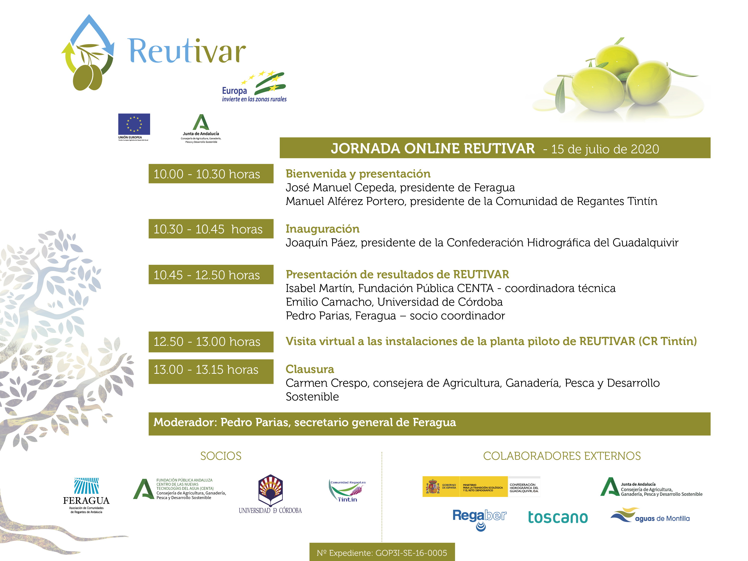 Dicha jornada contará con la participación de la consejera de Agricultura, Ganadería, Pesca, y Desarrollo Sostenible de la Junta de Andalucía, Carmen Crespo, que será la encargada de clausurar la jornada; y el presidente de la Confederación Hidrográfica del Guadalquivir (CHG), Joaquín Páez, que se encargará de inagurarla. Asimismo, intervendrá el presidente de Feragua, José Manuel Cepeda, y los responsables del resto de socios de REUTIVAR.