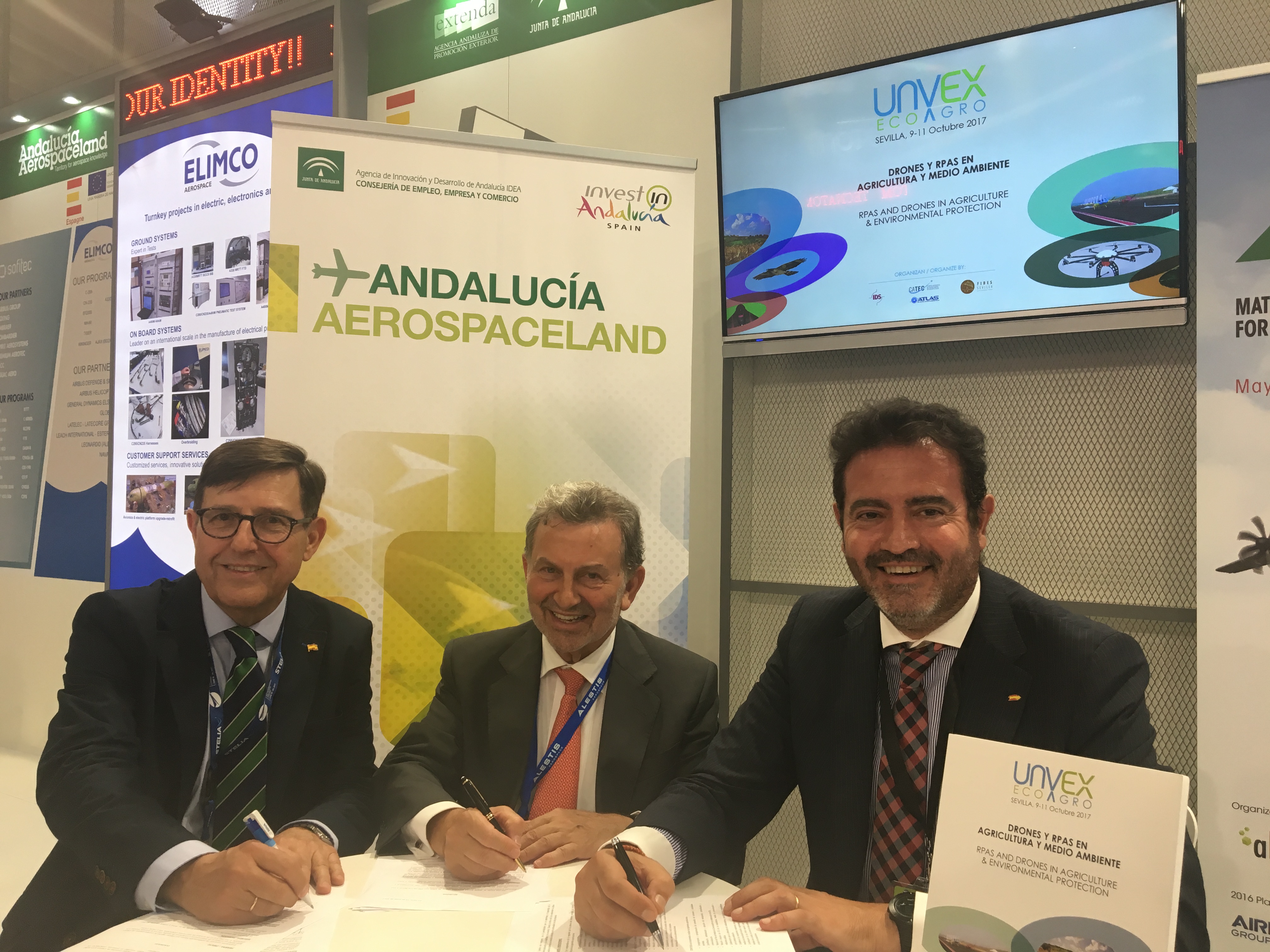 París, 19 de junio. El gobierno de la Junta de Andalucía ha mostrado hoy su respaldo en París a la primera edición de UNVEX ECO-AGRO, el mayor evento sobre los drones o sistemas no tripulados (UAS/RPAS) en España, que se celebrará del 9 al 11 de octubre de 2017 en el Palacio de Congresos y Exposiciones de Sevilla (FIBES). Esta feria contará con una jornada final para grandes demostraciones de vuelos fuera de línea de vista en el Centro de Vuelos Experimentales ATLAS, en Jaén.
