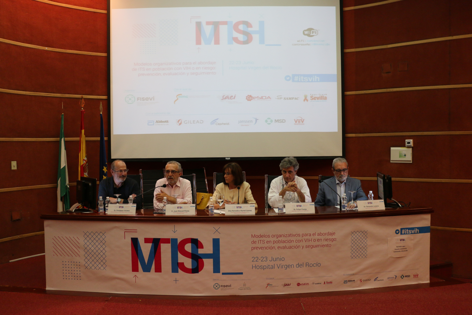 PIE DE FOTO. De izquierda a derecha: Pompeyo Viciana, director de la Jornada ITS/VIH Sevilla; Juan Manuel Flores, delegado del Área de Bienestar Social y Empleo del Ayuntamiento de Sevilla; Remedios Martel, directora general de Salud Pública y Ordenación Farmacéutica de la Consejería de Salud; Felipe Pareja, director médico del Hospital Universitario Virgen del Rocío; y Fernando Lozano, director de la Jornada ITS/VIH Sevilla.