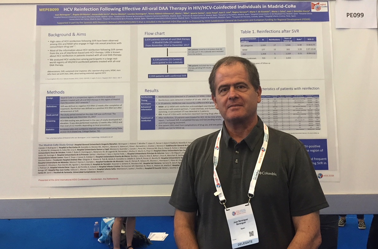 Amsterdam, 25 de julio de 2018.- Un estudio realizado por investigadores de GeSIDA (Grupo de Estudio del SIDA de la SEIMC) y de la RIS (Red de Investigación del SIDA) en colaboración con la Subdirección General de Farmacia y Productos Sanitarios de la Comunidad de Madrid revela que la reinfección por el virus de la hepatitis C (VHC) después de la cura con antivirales de acción directa (AAD) en personas con VIH y también infectados de VHC resultó 28 veces más frecuente en hombres que mantenían sexo con otros hombres (HSH) que en personas con antecedentes de consumo de drogas inyectadas. Los resultados de este trabajo de investigación, coordinado por los doctores Juan Berenguer (Hospital General Universitario Gregorio Marañón) y Juan González (Hospital Universitario La Paz) han sido presentados en la 22ª Conferencia Internacional del SIDA (AIDS 2018) que se celebra estos días en Amsterdam.