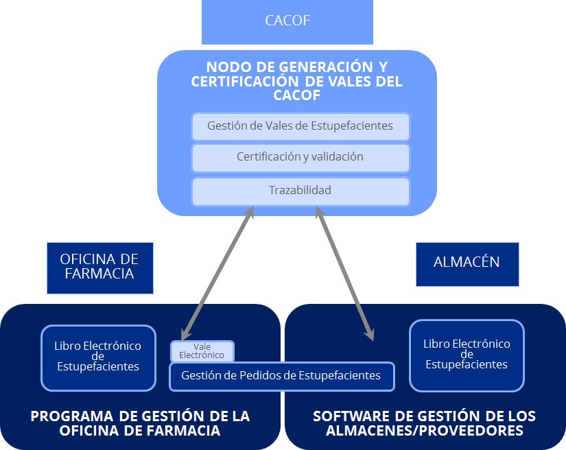 Para el farmacéutico es un proceso transparente, ya que éste realiza el pedido de estupefacientes desde su programa de gestión; de tal manera que al lanzar el pedido a su almacén proveedor, el programa de gestión se comunica con el Nodo del CACOF que le asigna el vale a cada uno de los estupefacientes que van en el pedido, y de forma transparente para la farmacia es transmitido al proveedor, que al recibirlo se comunica con el Nodo del CACOF que certifica la validez de dicho vale procediendo el almacén a suministrar el estupefaciente solicitado y anotar de forma automática la salida en su libro de estupefacientes. Todo este proceso se realiza en cuestión de segundos.