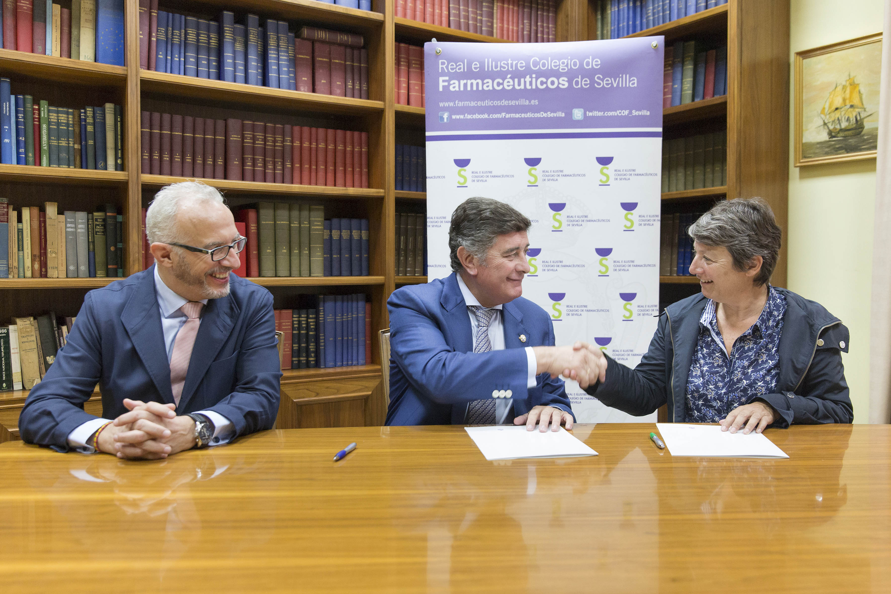 PIE DE FOTO: Manuel Pérez y Shane Fitch, presidente del Colegio de Farmacéuticos de Sevilla y Fundación Lovexair (respectivamente) rubrican el acuerdo de colaboración en presencia de Manuel Ojeda, vicepresidente del Colegio de Farmacéuticos.
