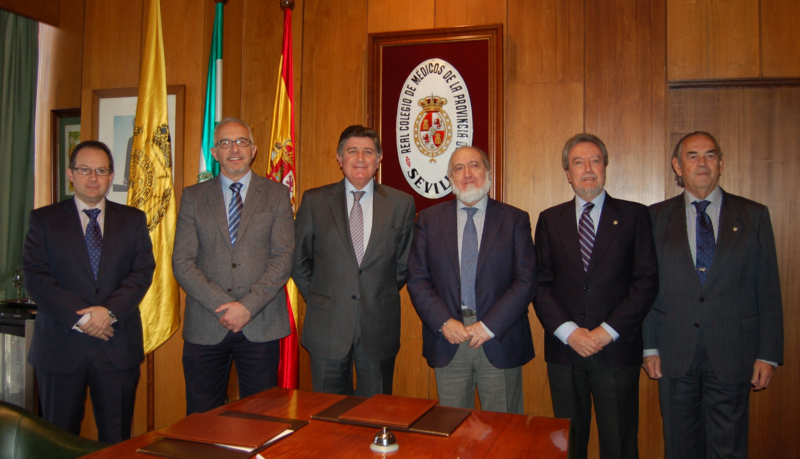 PIE DE FOTO: Representantes de los colegios de médicos y farmacéuticos de Sevilla, con sus presidentes en el centro, tras la firma del acuerdo.