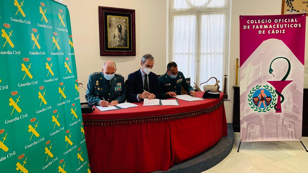 Cádiz, 28 de noviembre 2020.- Representantes de las comandancias de la Guardia Civil en Cádiz y Algeciras han suscrito hoy un convenio de colaboración con el Colegio de Farmacéuticos de Cádiz por el que los profesionales de las 497 oficinas de farmacia de toda la provincia colaborarán con la aplicación del Plan Mayor Seguridad, dirigido a la prevención y mejora de la seguridad de las personas de mayor edad y que constituye la principal herramienta con que en la actualidad cuenta el Instituto Armado para dotar de mayor seguridad a este grupo de especial vulnerabilidad.
