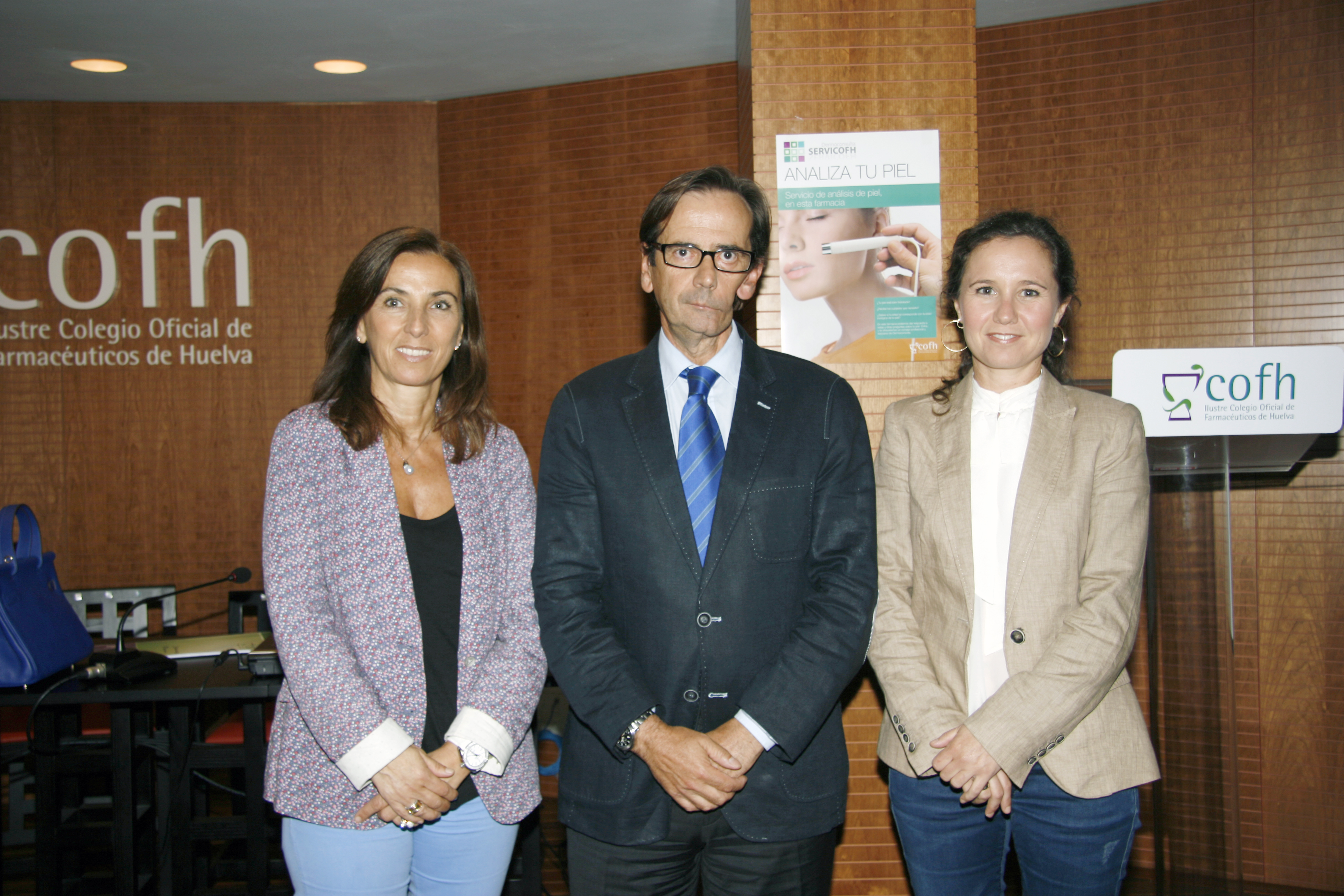 Pie de foto, de izquierda a derecha: Cristina Tiemblo, vocal Nacional de Dermofarmacia; Francisco Peinado, presidente del Colegio de Farmacéuticos de Huelva; y Fulvia Ronchel, vocal de Dermofarmacia del Colegio de Farmacéuticos de Huelva.