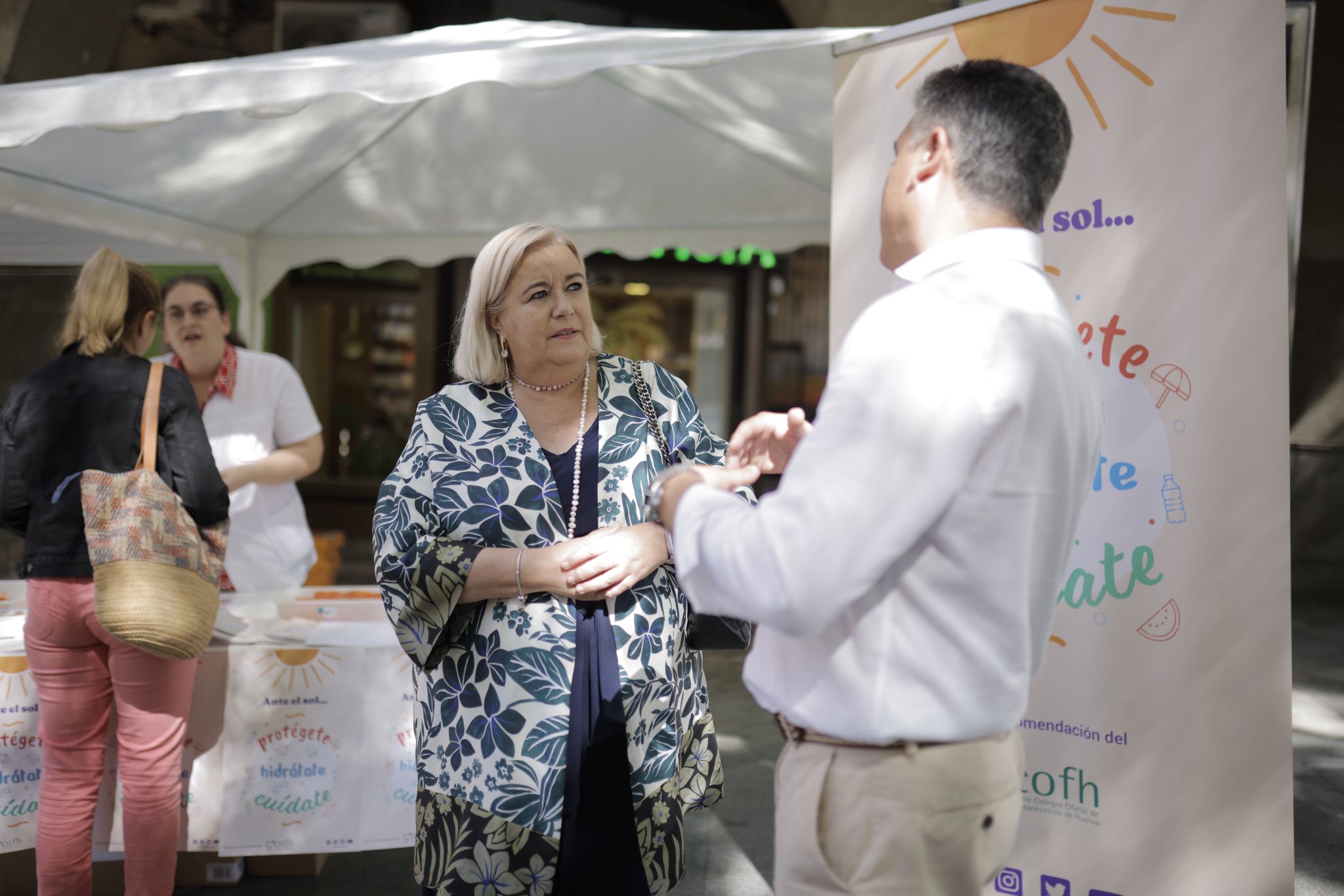 Huelva, 26 de mayo de 2022.- Los farmacéuticos de Huelva han salido hoy a la calle para mostrar a la población onubense consejos sobre cómo llevar a cabo una correcta fotoprotección, de manera especial ante los cercanos meses del verano, en los que se incrementa el número de horas que se pasa expuesto al sol en playas y piscinas.