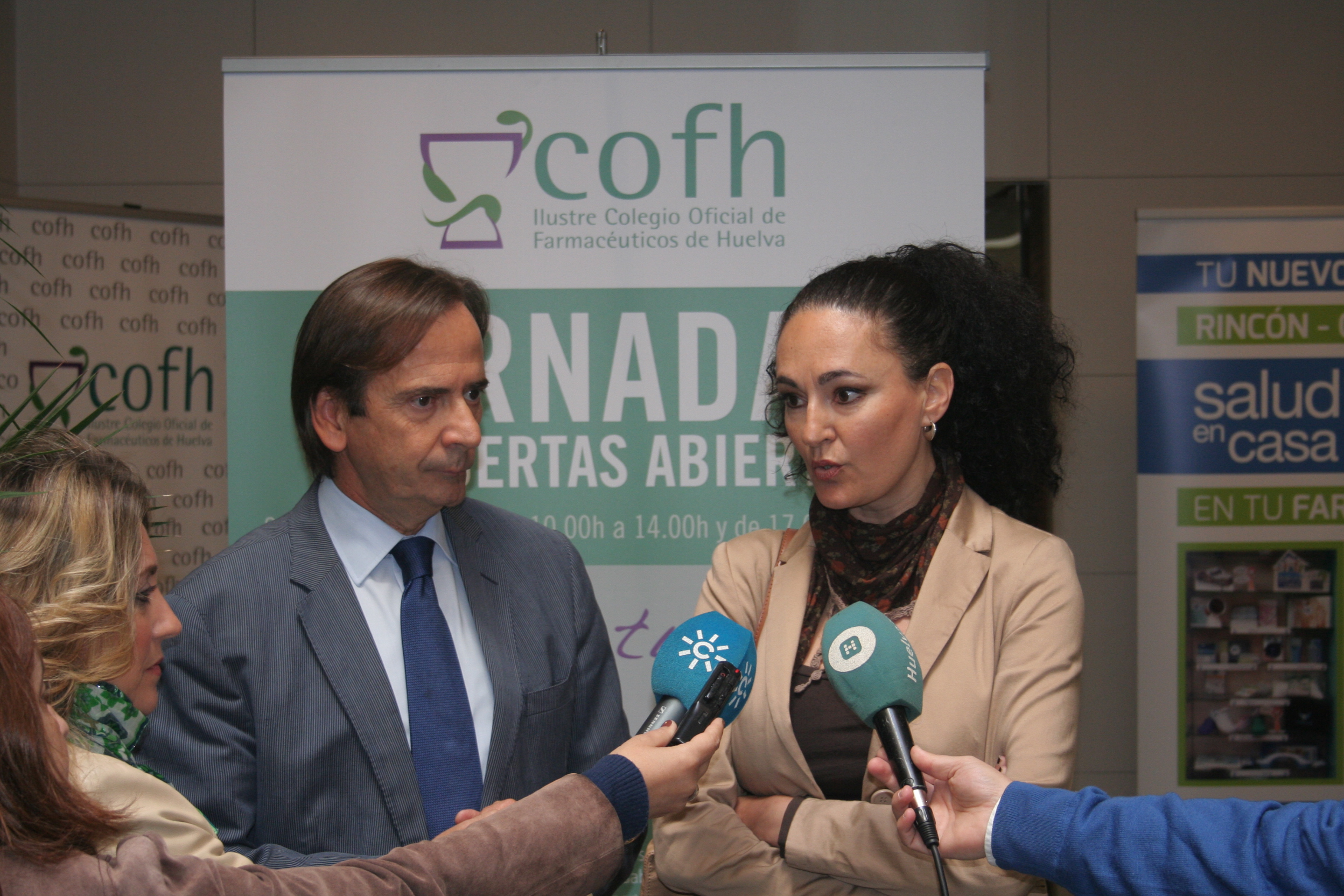 Pie de foto: Francisco Peinado Martínez, presidente del Colegio de Farmacéuticos de Huelva, y Lourdes Martín Palanco, delegada provincial de Salud y Bienestar Social de la Junta de Andalucía, durante la inauguración de las jornadas de puertas abiertas que celebra hoy la corporación farmacéutica onubense.