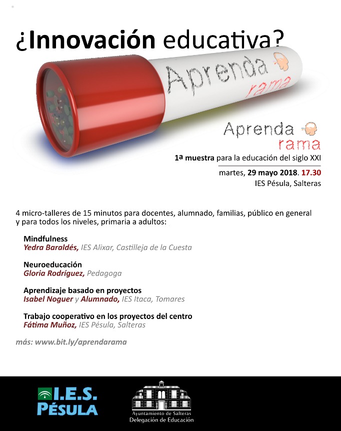 Salteras acogerá el próximo 29 de mayo, desde las 17:30 horas, una jornada innovación educativa, APRENDERAMA, celebrada con el apoyo de la Delegación de Educación del Ayuntamiento y organizada por el IES Pésula. El evento, que está dirigido a docentes, alumnado, familias y cualquier persona interesada en las últimas tendencias de este ámbito, responde al objetivo estratégico del Ayuntamiento de Salteras de “colaborar a la promoción formativa de la ciudadanía, impulsando y apoyando cuantas iniciativas en este sentido tengan lugar en el municipio”, explica el alcalde, Antonio Valverde.