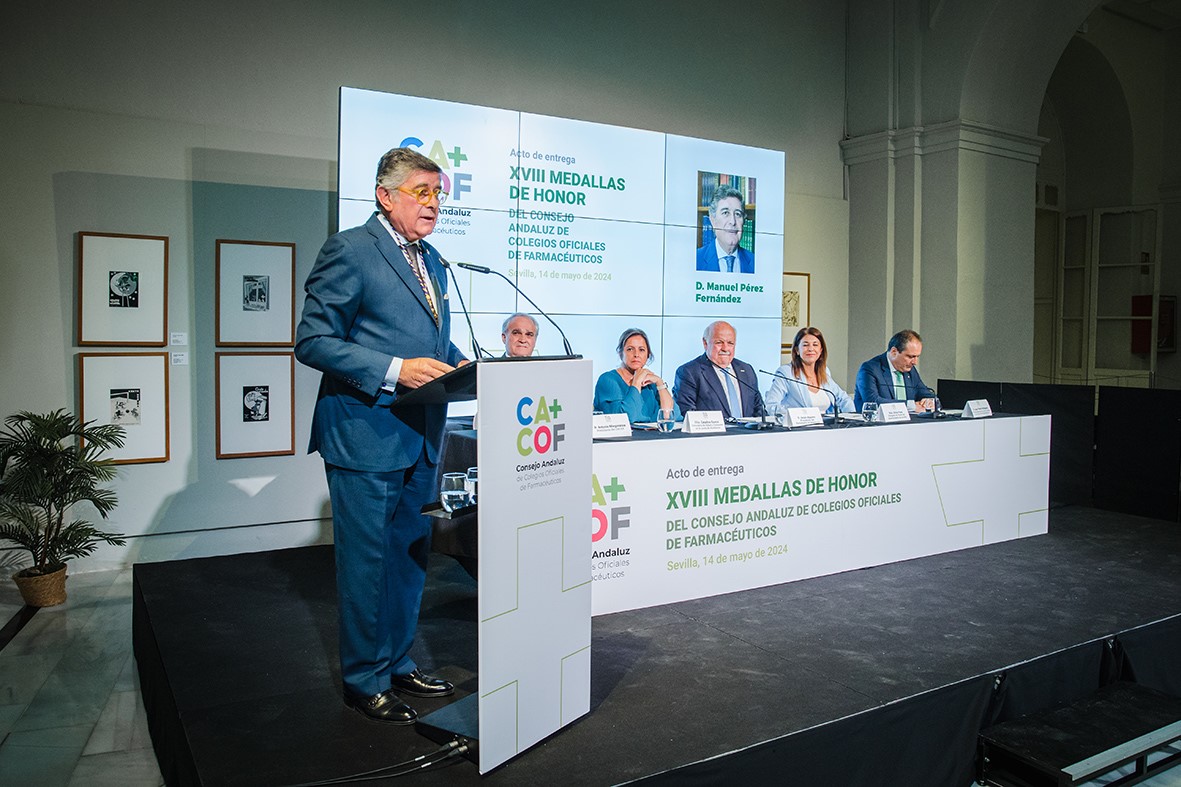 Sevilla, 15 de mayo de 2024.- El farmacéutico sevillano Manuel Pérez Fernández ha recibido la medalla de honor del Consejo Andaluz de Colegios de Farmacéuticos (CACOF) en reconocimiento a su trayectoria profesional y su dedicación excepcional a la defensa y representación de la profesión a través de su actividad colegial. El reconocimiento de la farmacia andaluza a quien fuera presidente del Colegio de Farmacéuticos de Sevilla durante más de 23 años congregó ayer a más de un centenar de farmacéuticos y personalidades de la sanidad andaluza, y contó con la participación del presidente del Parlamento de Andalucía, Jesús Aguirre; de la consejera de Salud y Consumo de la Junta de Andalucía, Catalina García; y de la delegada de Salud del Ayuntamiento de Sevilla, Silvia Pozo.