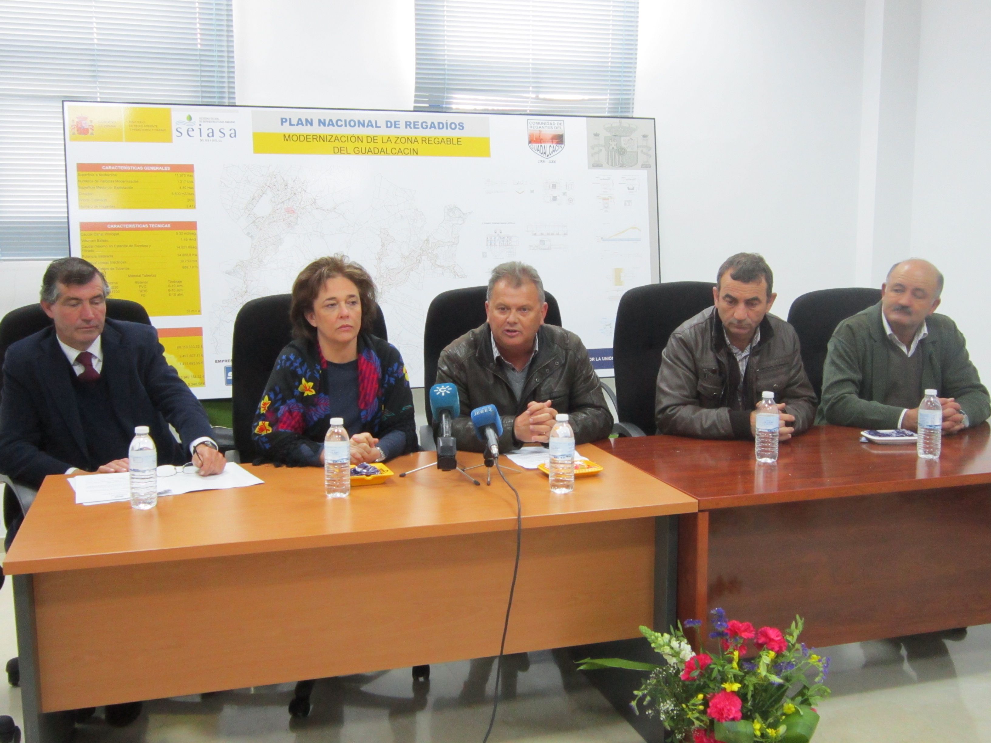 Durante la rueda de prensa, de izquierda a derecha: Antonio León, presidente de Eugenio Olid; Margarita Bustamante, presidenta de FERAGUA; Manuel Siles, presidente CORECA; Jacinto Carrasco, presidente de la Comunidad de Regantes Guadalcacín; y José Madrid, de Agricultores Portuenses Doña Blanca.