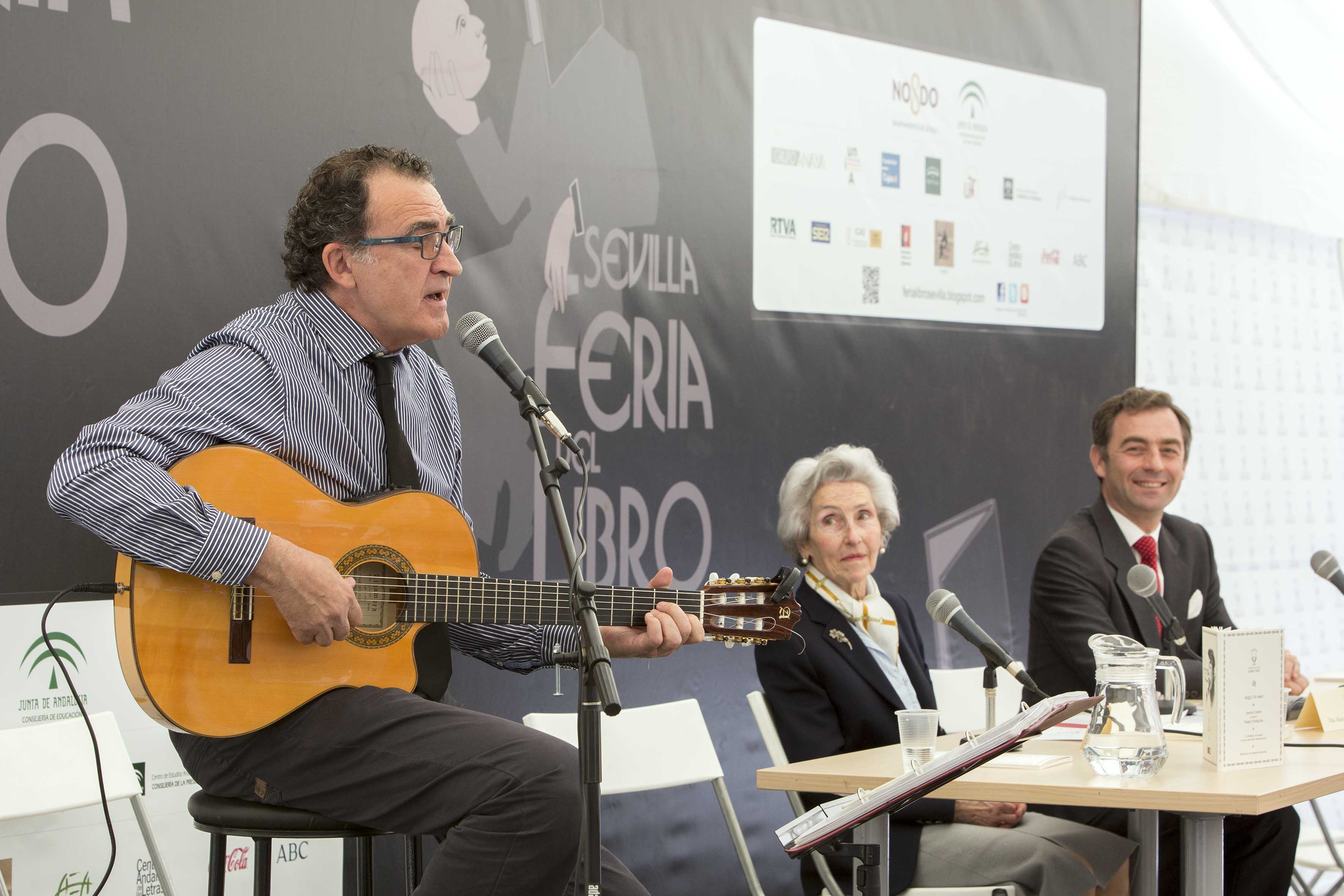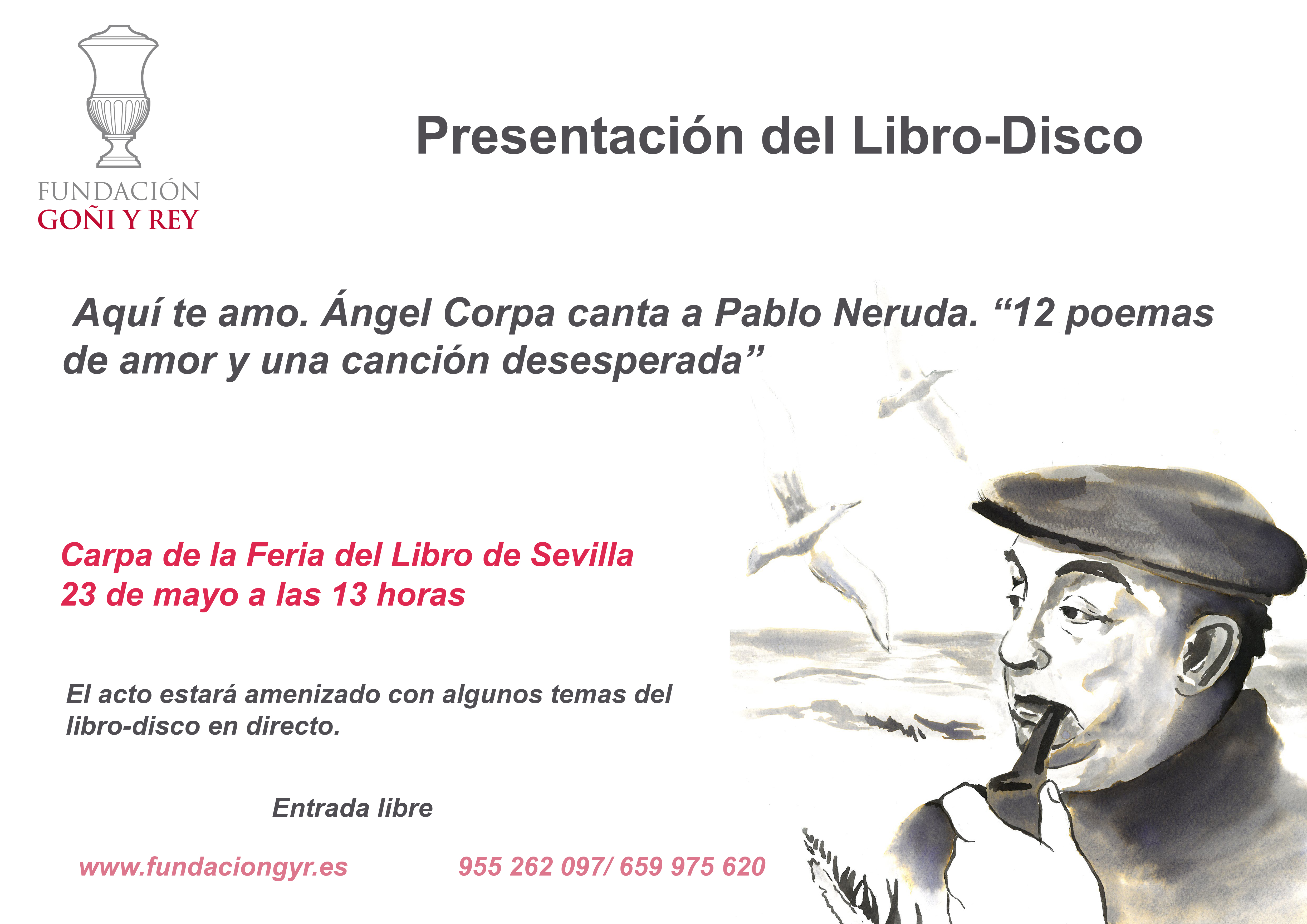 Sevilla, 23 de mayo de 2014.- La Fundación Goñi y Rey, promovida por el Colegio de San Francisco de Paula, ha presentado hoy en la Feria del Libro el libro-CD ‘Aquí te amo. 12 poemas de amor y una canción desesperada. Ángel Corpa canta a Pablo Neruda’, en el que el cantautor y miembro de Jarcha ha musicado e interpretado poemas del autor chileno, Premio Nobel de Literatura. La obra ha sido prologada por Yasmina Khadra, seudónimo femenino del escritor argelino en lengua francesa Mohammed Moulessehoul, también Patrono de la Fundación.
