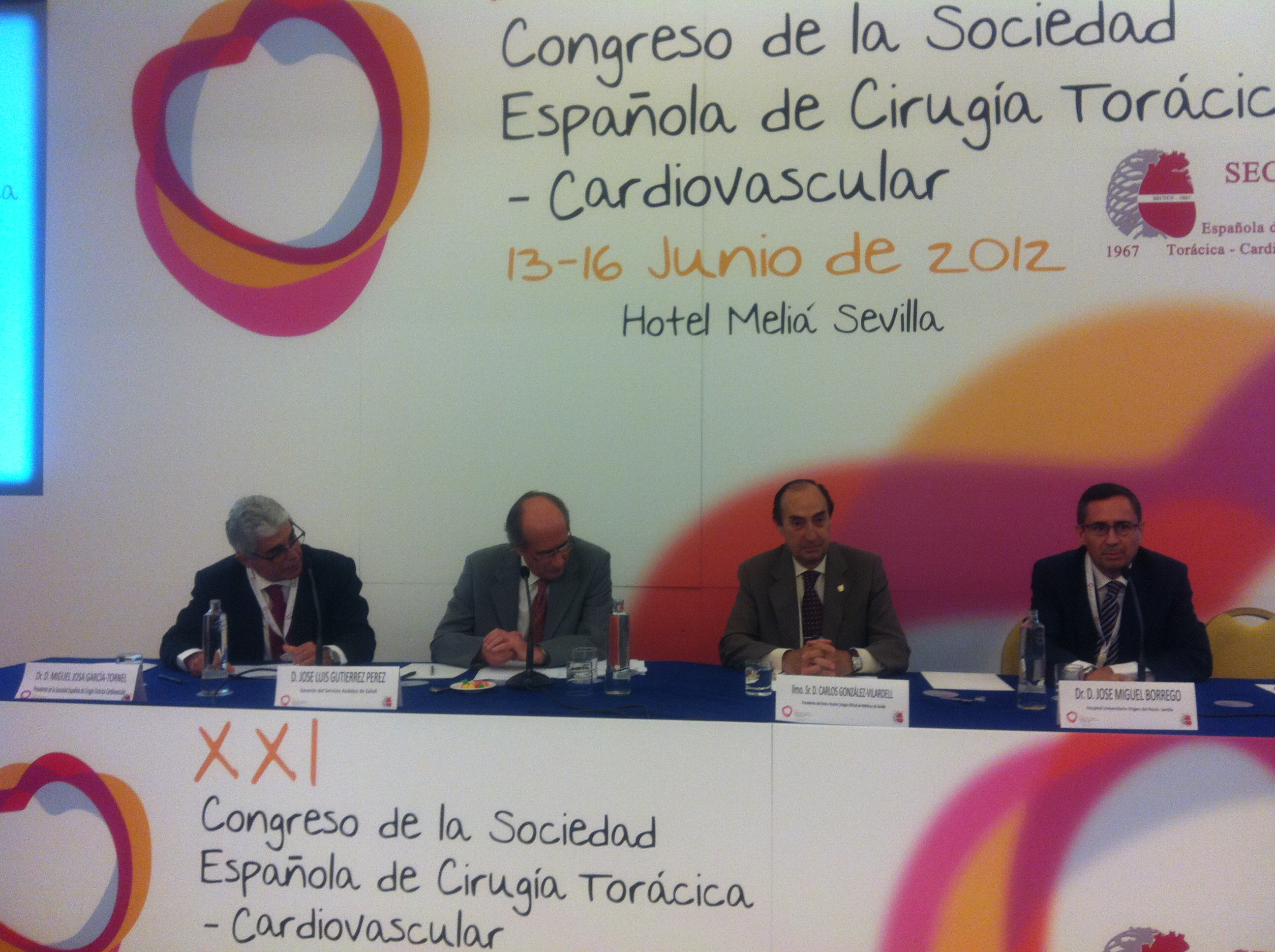 Foto: De izquierda a derecha, Dr. Miguel Josa; Juan Tomás García Martínez, director general de Asistencia Sanitaria y Resultados en Salud; Carlos González Vilardell, presidente del Colegio de Médicos de Sevilla; y Dr. José Miguel Borrego, Jefe de Cirugía Cardiaca del Hospital Virgen del Rocío de Sevilla durante la inauguración del XXI Congreso SECTCV 2012.