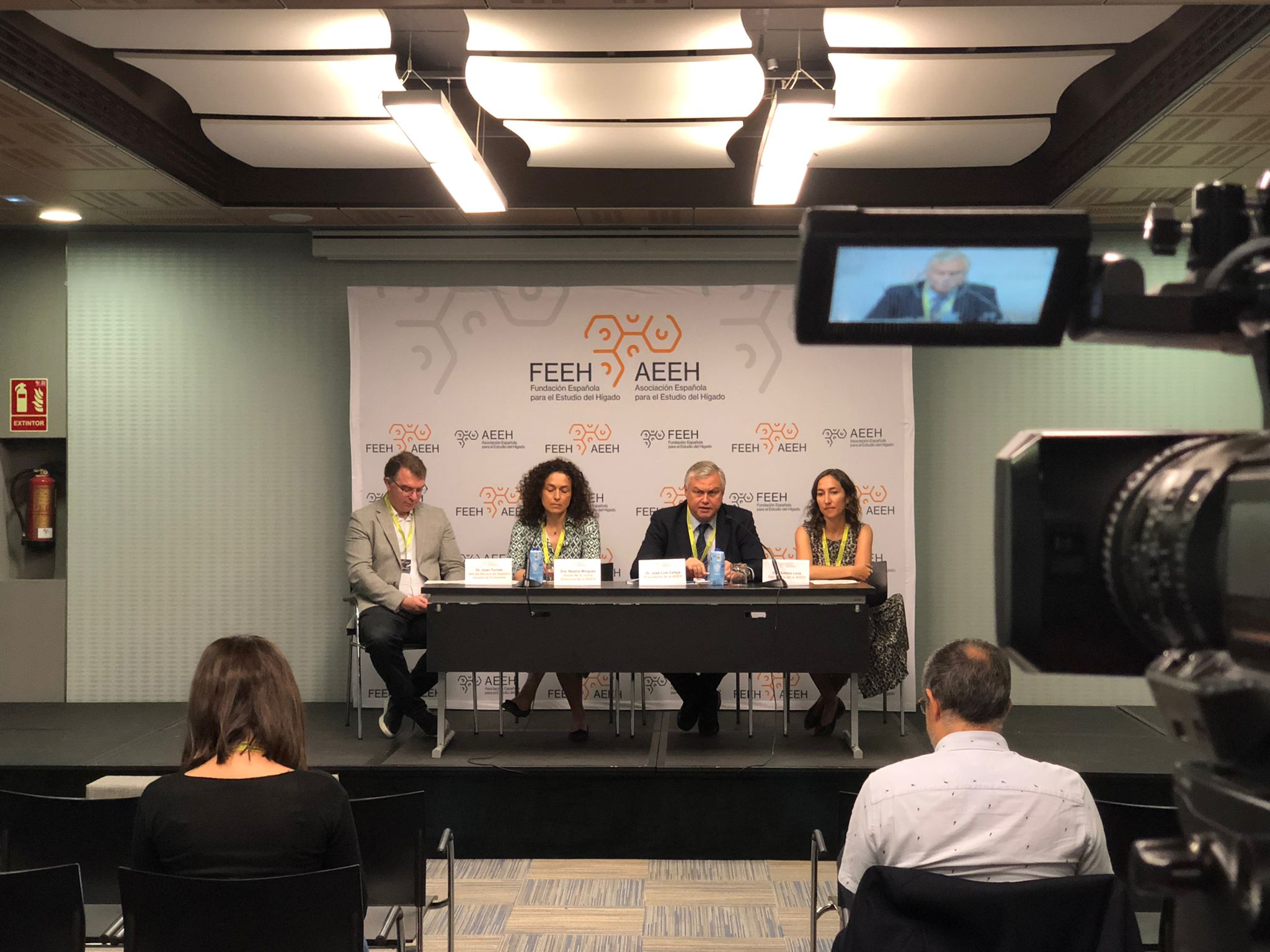 Rueda de prensa de presentación del 47º Congreso de la AEEH. De izq. a dcha: Dr. Juan Turnes, jefe del Servicio de Digestivo del H.U. de Pontevedra, Dra. Beatriz Mínguez, vocal de la Junta Directiva de la AEEH. Hospital Universitario Vall d´Hebron de Barcelona, Dr. José Luis Calleja, presidente de la AEEH. Jefe del Servicio de Gastroenteorología y Hepatología del H.U. Puerta de Hierro de Madrid, y Dra. Sabela Lens, secretaria de la AEEH. Hospital Clínic de Barcelona.