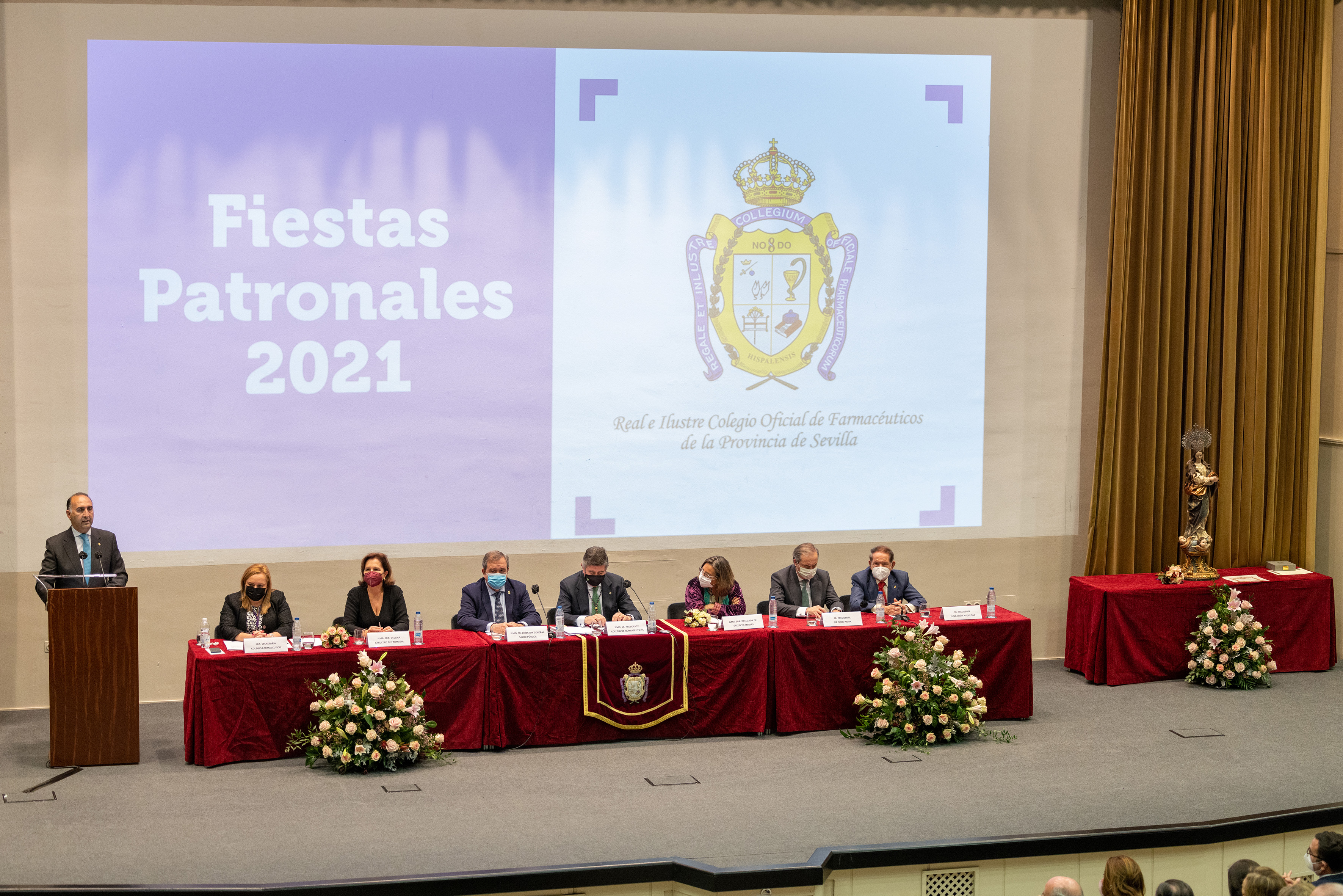 Sevilla, 29 de noviembre de 2021.- El Real e Ilustre Colegio Oficial de Farmacéuticos de la Provincia de Sevilla, junto con la Fundación Farmacéutica Avenzoar, celebra estos días las Fiestas en Honor su Patrona, la Inmaculada Concepción. El acto central de la celebración ha sido la lectura del XLII Pregón de la Patrona, a cargo del colegiado y Hermano Mayor de la Hermandad de la Candelaria, Álvaro Delgado Gómez, que fue presentado la pregonera del año anterior, Adela Larrey. Alvaro Delgado ejerce su labor en la industria farmacéutica, en la compañía Esteve, y el título de su pregón fue “Farmacia, Sevilla y María”. Al acto de lectura del Pregón y entrega de las insignias de Oro y Plata de la Corporación asistieron el director general de Salud Pública de la Consejería de Salud de la Junta de Andalucía, José María de Torres, la Delegada Territorial de Salud, Regina Serrano, la decana de la Facultad de Farmacia, María Alvarez de Sotomayor, el presidente de la Fundación Farmacéutica Avenzoar, José Antonio Neto y el presidente de Bidafarma, Antonio Pérez Ostos.