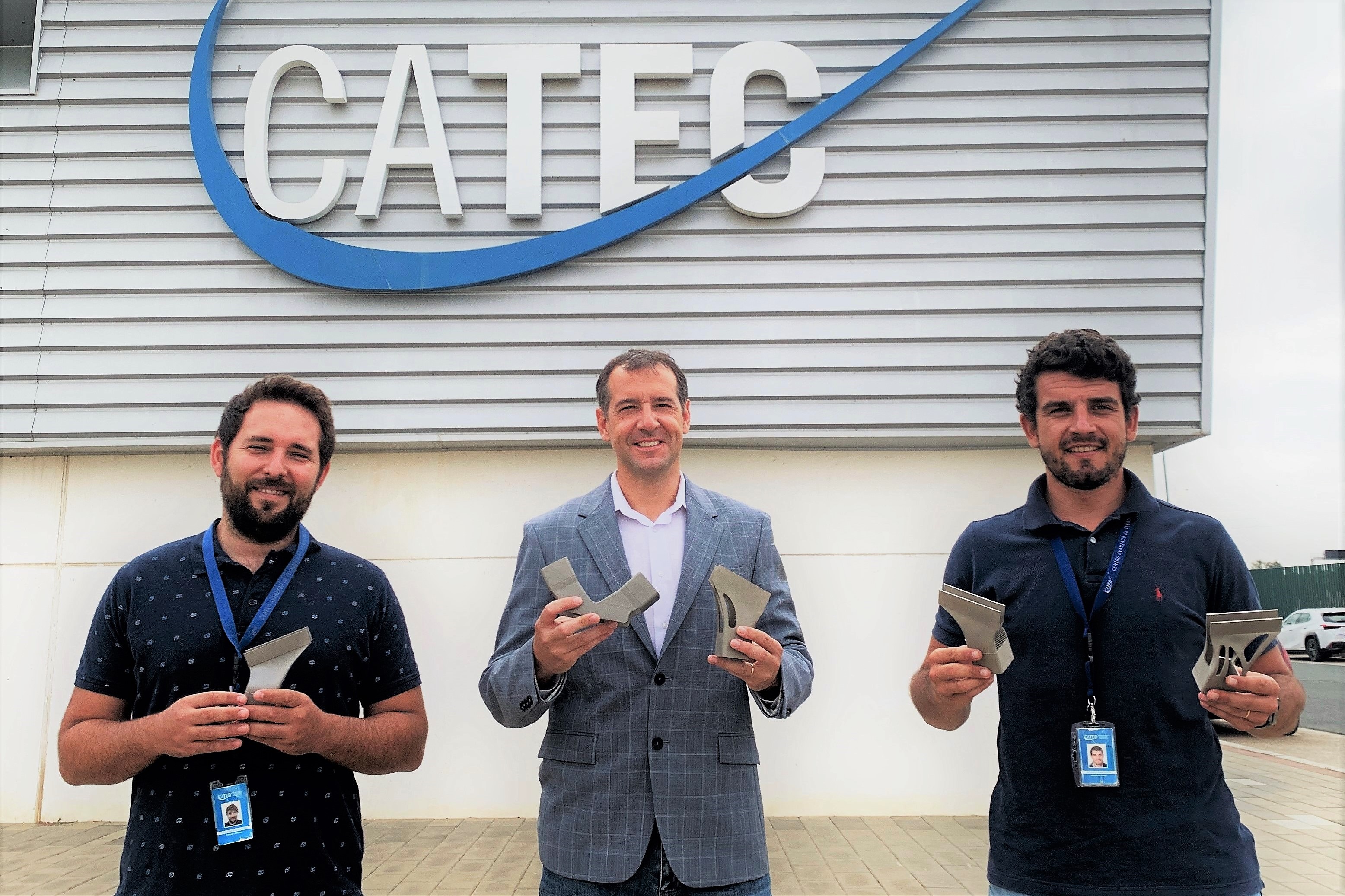 Fernando Lasagni, Director Técnico de Materiales y Procesos de CATEC (centro), acompañado de Antonio Periñán (dcha) y Carlos Galleguillos (izq) y las piezas fabricadas.