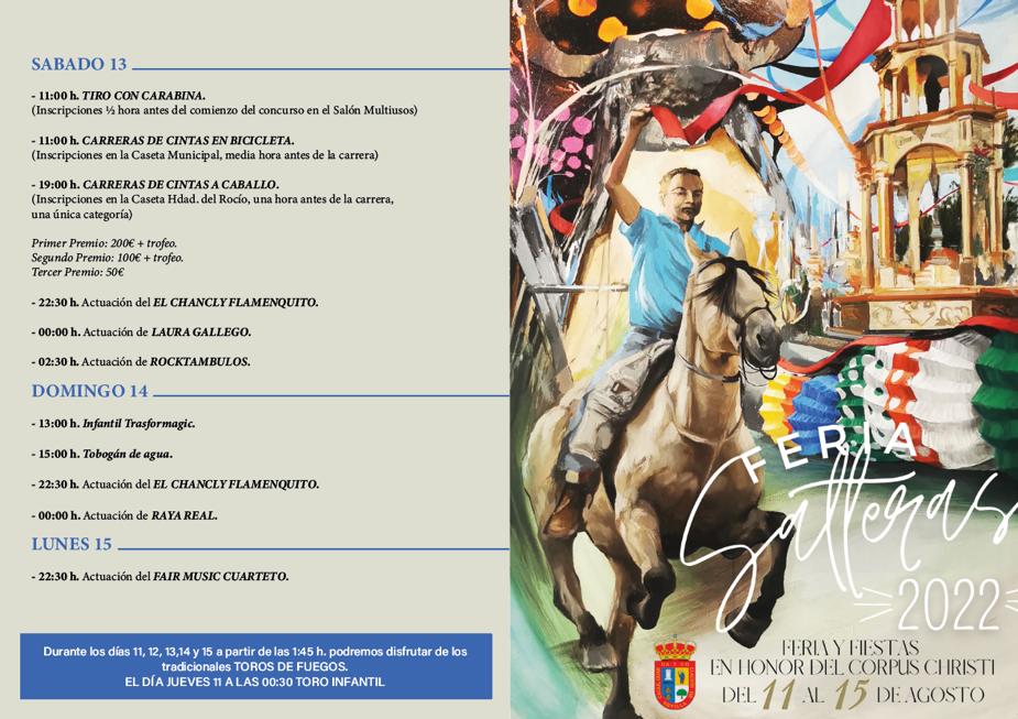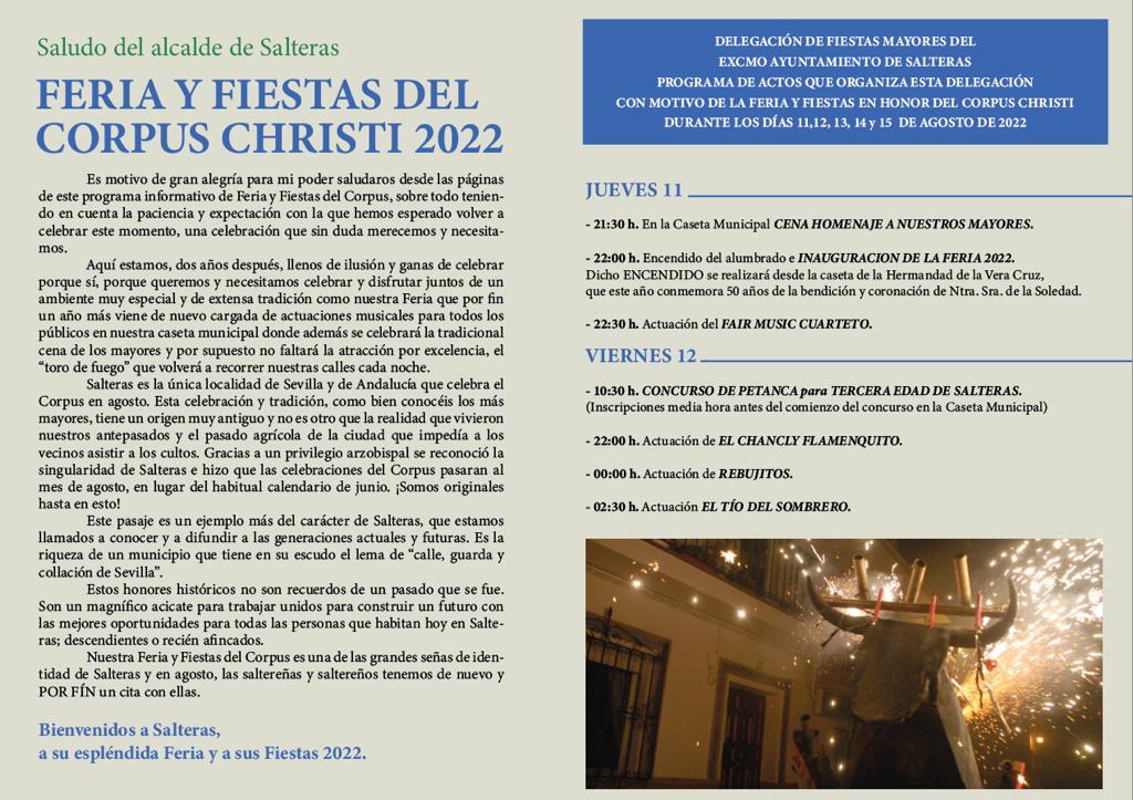 El Excmo. Ayuntamiento de Salteras continúa potenciando las actividades diurnas, que se completarán al final de la jornada con espectáculos musicales, así como los tradicionales Toros de Fuego, que recorren el centro de Salteras cada madrugada, del 11 al 15 de agosto, a partir de la 01:45 horas. En la jornada del jueves 11, se celebró un Toro de Fuego, a las 00:30, especialmente organizado para menores.