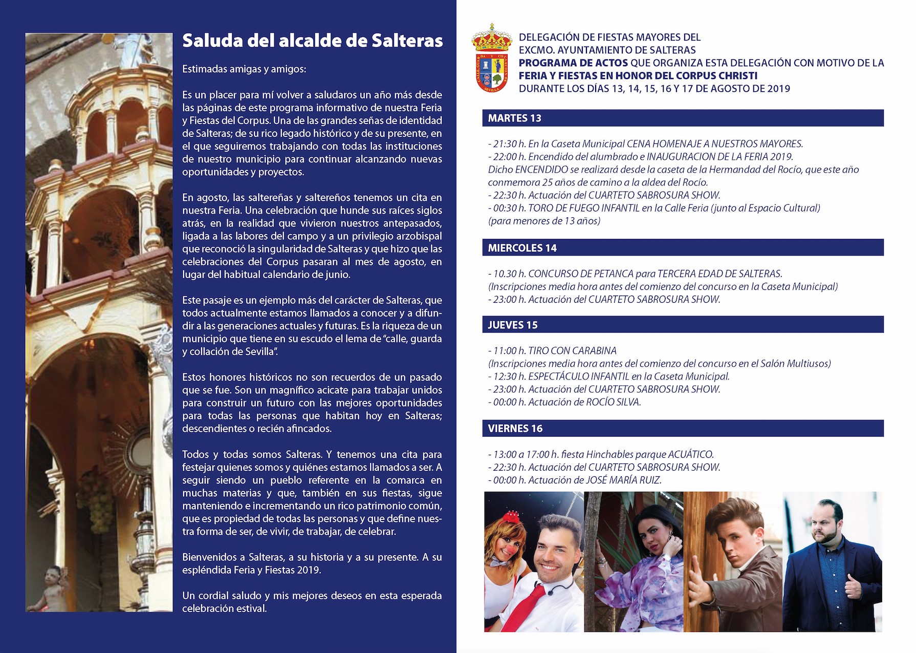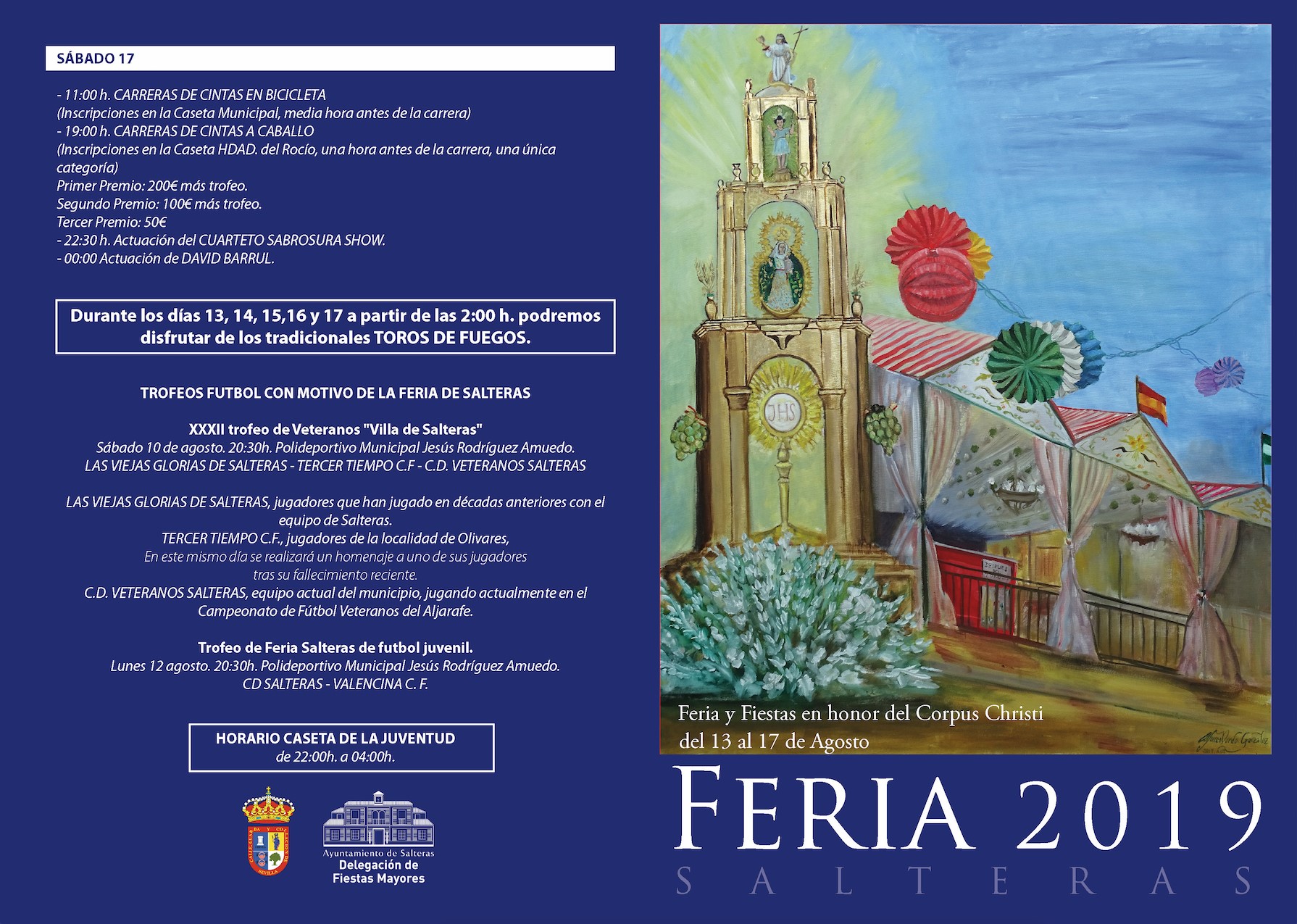 La delegación municipal de Fiestas Mayores viene potenciando en los últimos años las actividades diurnas, que se completan al final de la jornada con espectáculos musicales, así como los tradicionales Toros de Fuego, que recorren el centro de Salteras cada madrugada, del 13 al 17 de agosto, a partir de las 02:00 horas. En la jornada del martes, se celebrará un Toro de Fuego Infantil, a las 00:30, especialmente organizado para menores de 13 años.