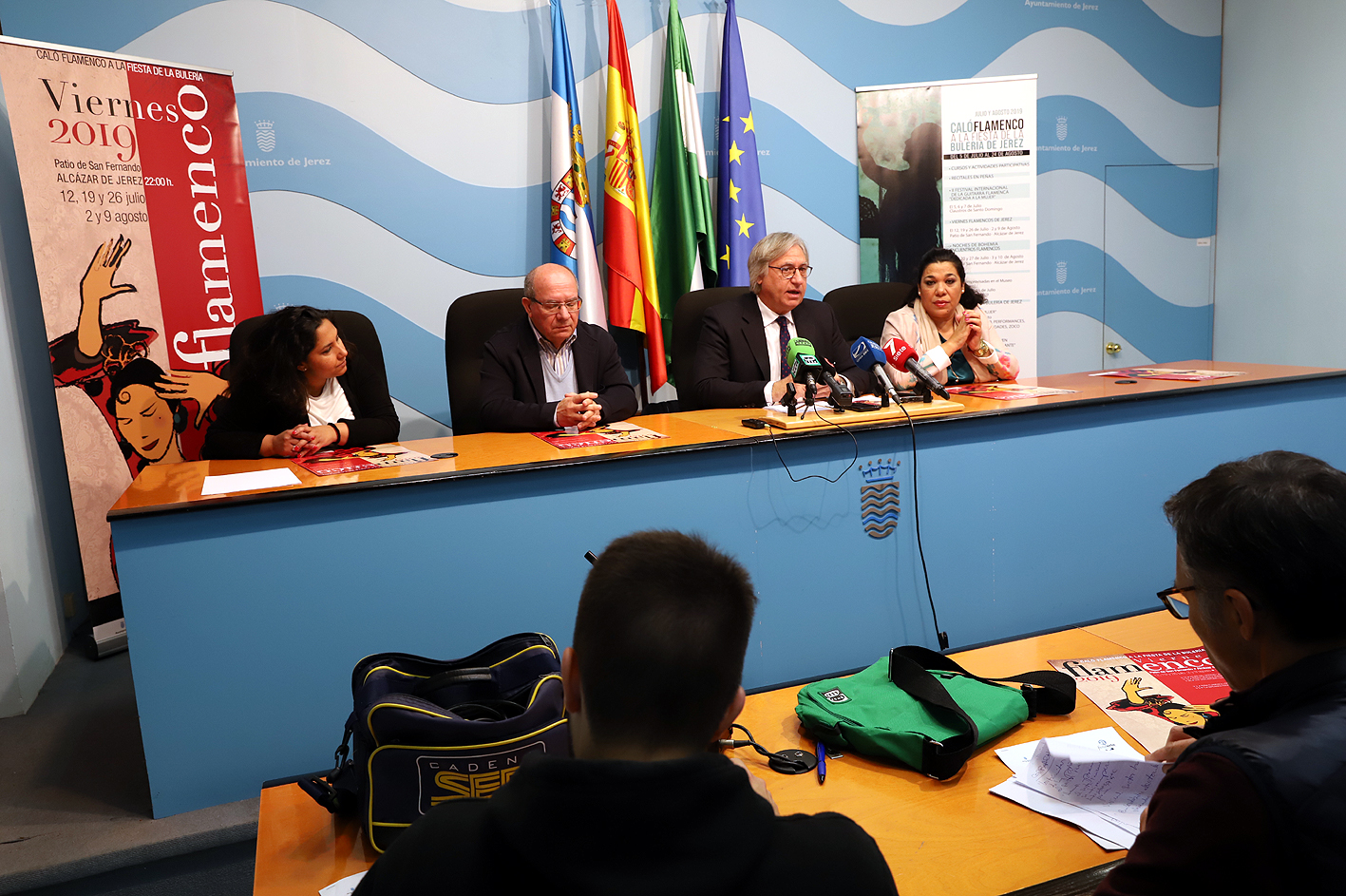 El teniente de alcaldesa de Urbanismo, Dinamización Cultural, Patrimonio y Seguridad, Francisco Camas, junto al presidente de la Federación de Peñas Flamencas, Jesús López y las artistas, Felipa del Moreno y Tomasa Guerrero, ‘La Macanita’, ha presentado el ciclo de los Viernes Flamencos 2019, que tendrá lugar los días 12, 19 y 26 de julio, y el 2 y 9 de agosto, en el Patio de San Fernando del Alcázar, enmarcado en la programación Caló Flamenco a la Fiesta de la Bulería