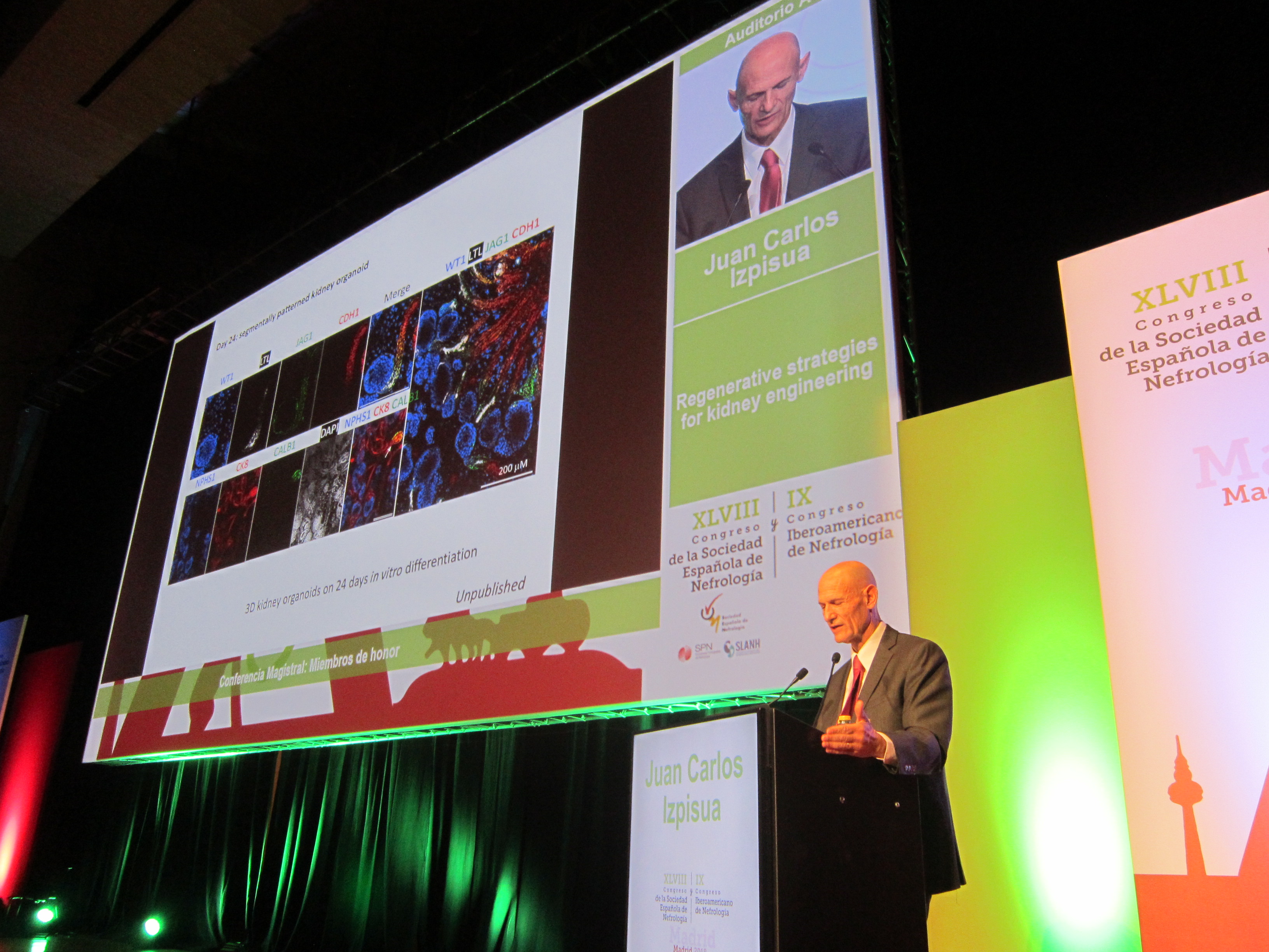 Izpisúa Belmonte, que ha ha sido nombrado miembro de honor de la S.E.N. en reconocimiento a sus investigaciones y trabajos relacionados con el ámbito de la nefrología y su trayectoria investigadora en general, ha presentado los últimos avances en el desarrollo de medicina regenerativa y células madre para su aplicación en diversos campos médicos, entre ellos el relacionado con el riñón, y que han supuesto la creación de los denominados organoides, órganos desarrollados por células madres que han permitido que se puedan estudiar y analizar en animales las causas y mutaciones de diversas enfermedades y corregirlas. En concreto ha explicado el caso de la creación de riñones en ratones a través de células embrionarias, que ha posibilitado a su equipo de investigación realizar una corrección molecular en estos animales, e impedir la aparición de la enfermedad renal. “Es un pequeño avance, nos permite estudiar las células del riñón, desarrollar un organoide que no es funcional, pero que sí ayuda a que podamos corregir la mutación de la enfermedad y abrir un campo para desrarrollar nuevos fármacos y tratamientos que puedan frenar la pérdida del funcionamiento de los riñones”, ha indicado.