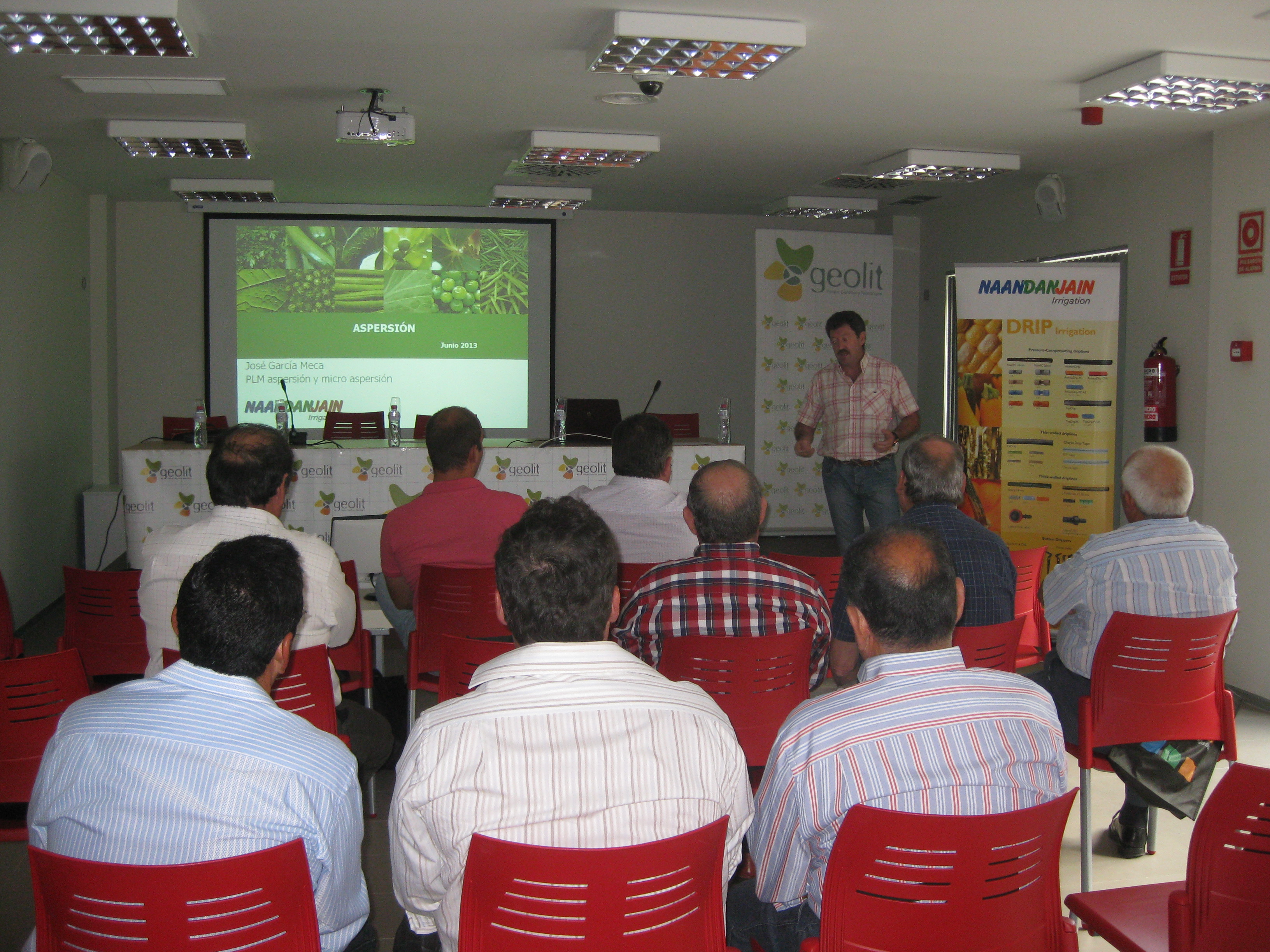 Jaén, 10 de junio de 2013.- José García Meca, responsable de productos de aspersión y microaspersión de NaanDanJain, ha ofrecido una charla informativa en el Parque Científico y Tecnológico Geolit dirigida a agricultores de la zona de la Vega de Jaén, a los que explicó los beneficios de la modernización de los sistemas de riego usados en la actualidad. En concreto, el delegado de NaanDanJain, que intervino junto a representantes de la firma Sireco, expuso las ventajas de la sustitución del riego por goteo por la aspersión, una tecnología óptima para riego en terrenos llanos y cultivos propios de la zona como como maíz, algodón y otros cultivos hortícolas de la zona.