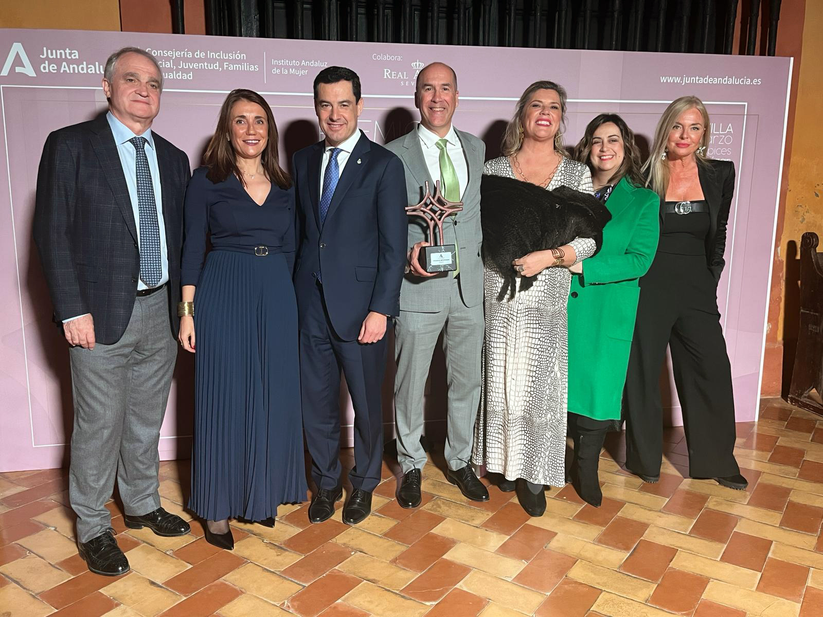 El presidente del Colegio de Farmacéuticos de Cádiz, Alberto Virués, recibió ayer de manos del presidente de la Junta de Andalucía, Juan Manuel Moreno, este premio de la Consejería de Inclusión Social, Juventud, Familias e Igualdad y el Instituto Andaluz de la Mujer (IAM), concedido por su iniciativa “Farmacia Espacio Seguro”.