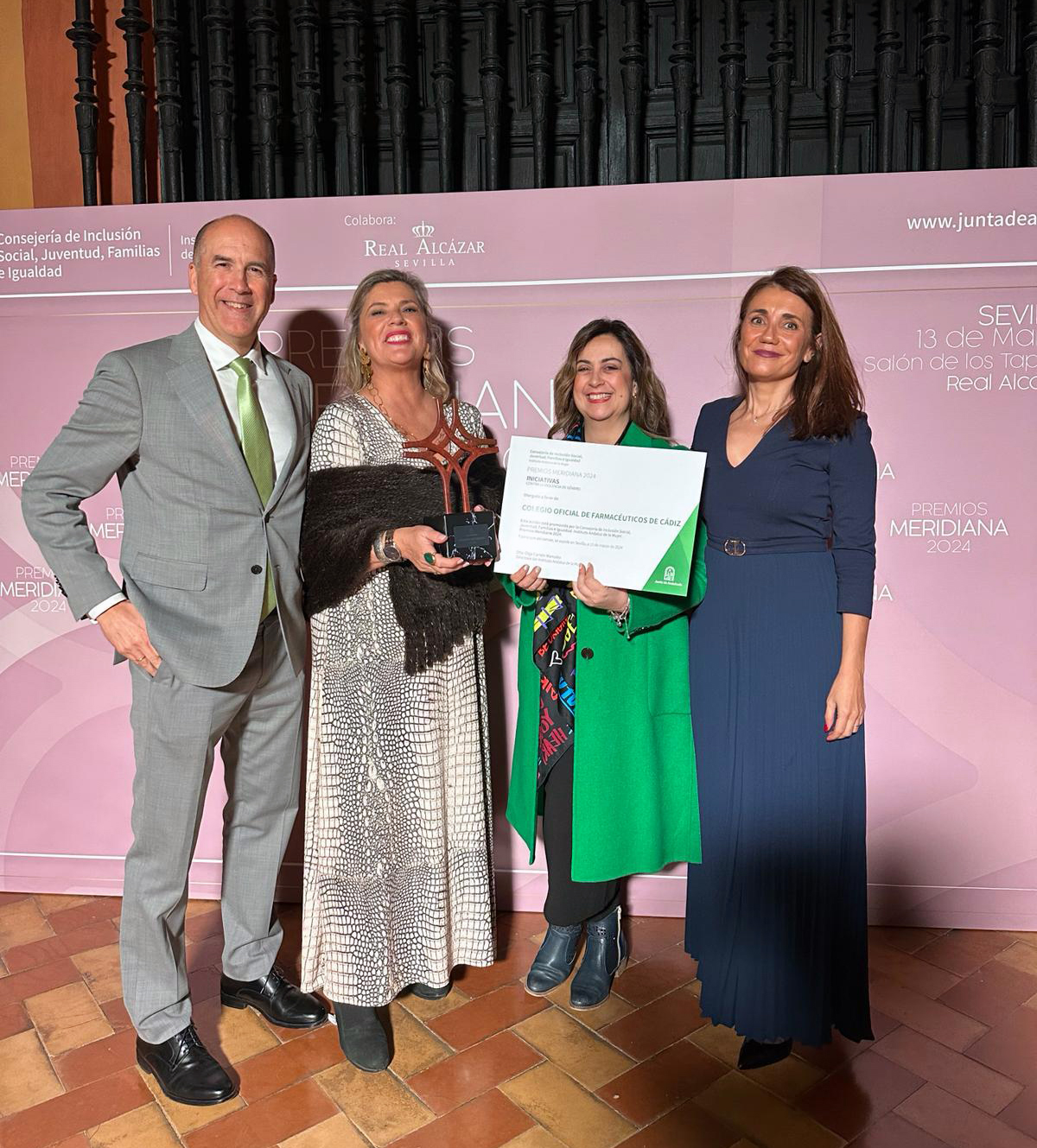 Este reconocimiento que cada año concede la Consejería de Inclusión Social, Juventud, Familias e Igualdad a través del Instituto Andaluz de la Mujer (IAM) ha sido otorgado en la categoría “Iniciativas contra la violencia de género”, y fue entregado ayer en la gala de los premios que tuvo lugar en los Reales Alcázares de Sevilla. El galardón fue recogido por el presidente del Colegio de Farmacéuticos de Cádiz, Alberto Virués, quien acudió al acto junto a la secretaria, Sandra Pérez; la vocal de Farmacia Social, Lola Palomino; y la vicesecretaria María López.
