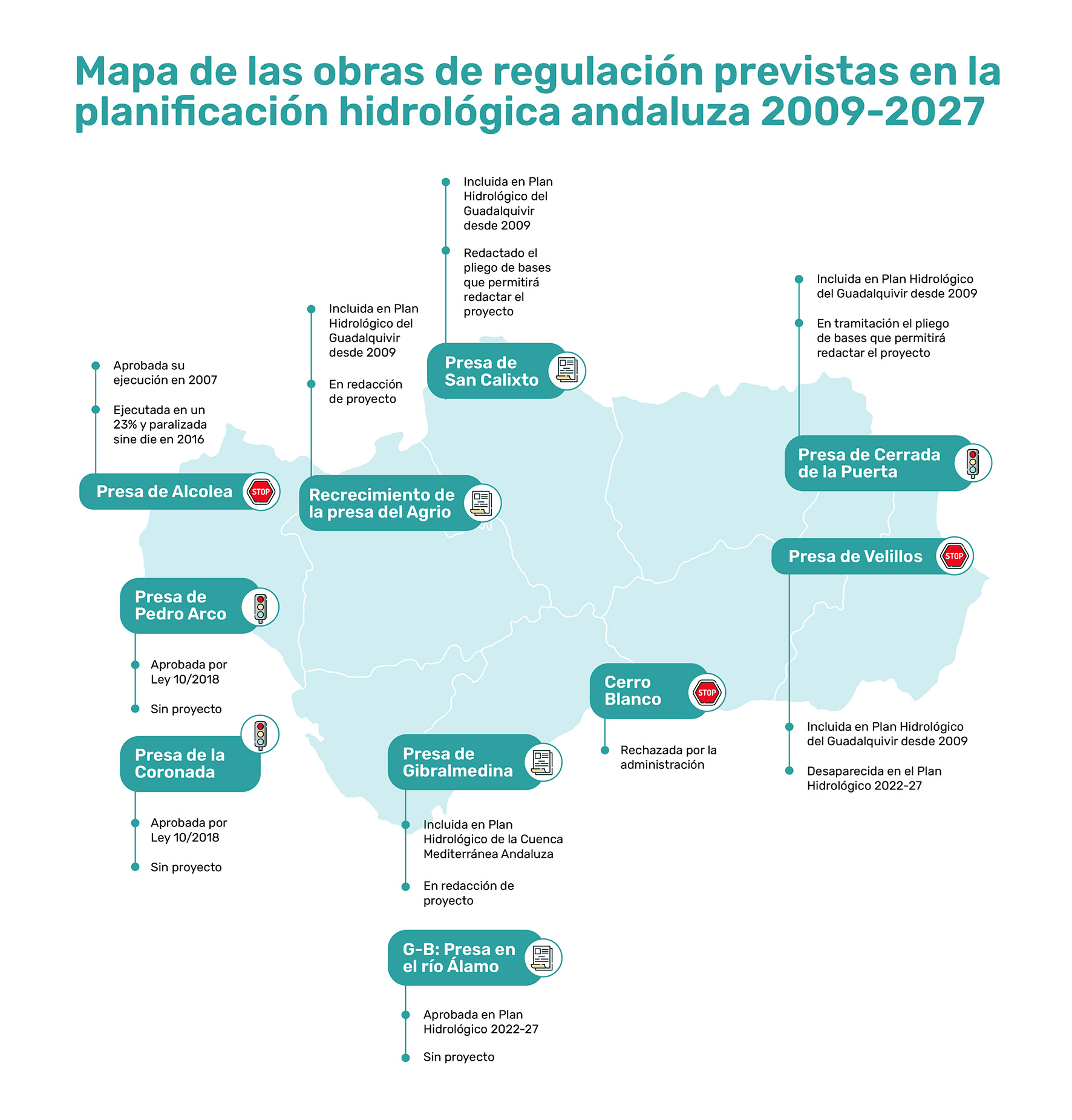 Además, en este tiempo, otras dos presas que fueron aprobadas en la planificación, concretamente Velillos en Granada y Cerro Blanco en Málaga, finalmente fueron descartadas por más que dudosos motivos medioambientales