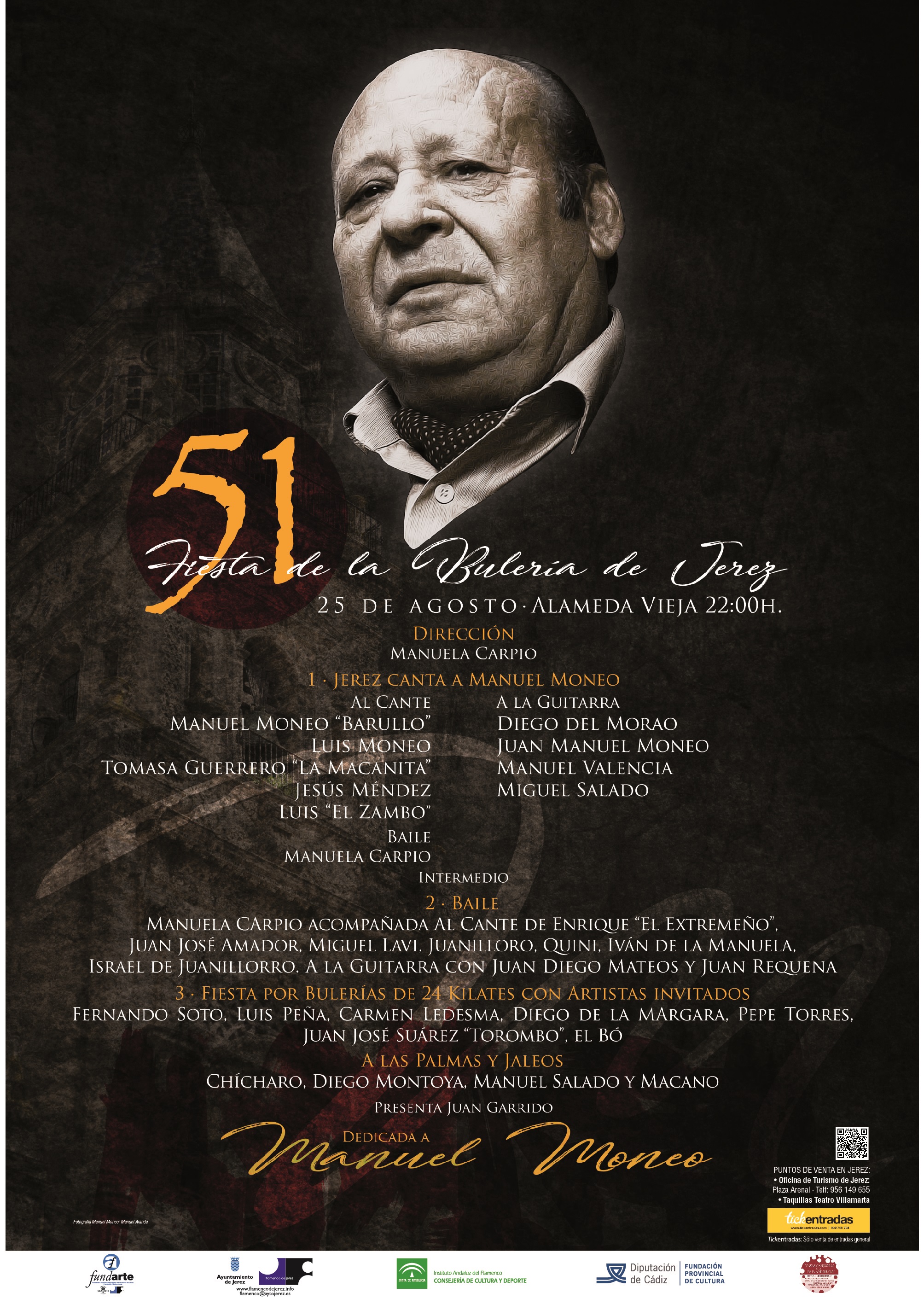 Y ahí estará Manuela Carpio para poner, junto a su grupo, el compás del baile. Pero ella, siempre generosa con los suyos, no estará sola, llega con Enrique 'El Extremeño', Juan José Amador o Miguel Lavi, entre otros. En su deseo está, como directora artística, abrir las puertas a otros compañeros de ciudades como Sevilla o Morón, porque en esos lugares también fue, y será, querido Moneo. Carmen Ledesma, Pepe Torres, Luis Peña, El Torombo, Diego de la Margara, Fernando Soto y El Bó, no quieren perderse la noche grande del arte de Jerez. Una gente de 24 kilates. El llanto por la pérdida de Manuel se mezclará con la alegría de todo un pueblo, a compás, que disfruta recordando a uno de los insignes del cante de Jerez.