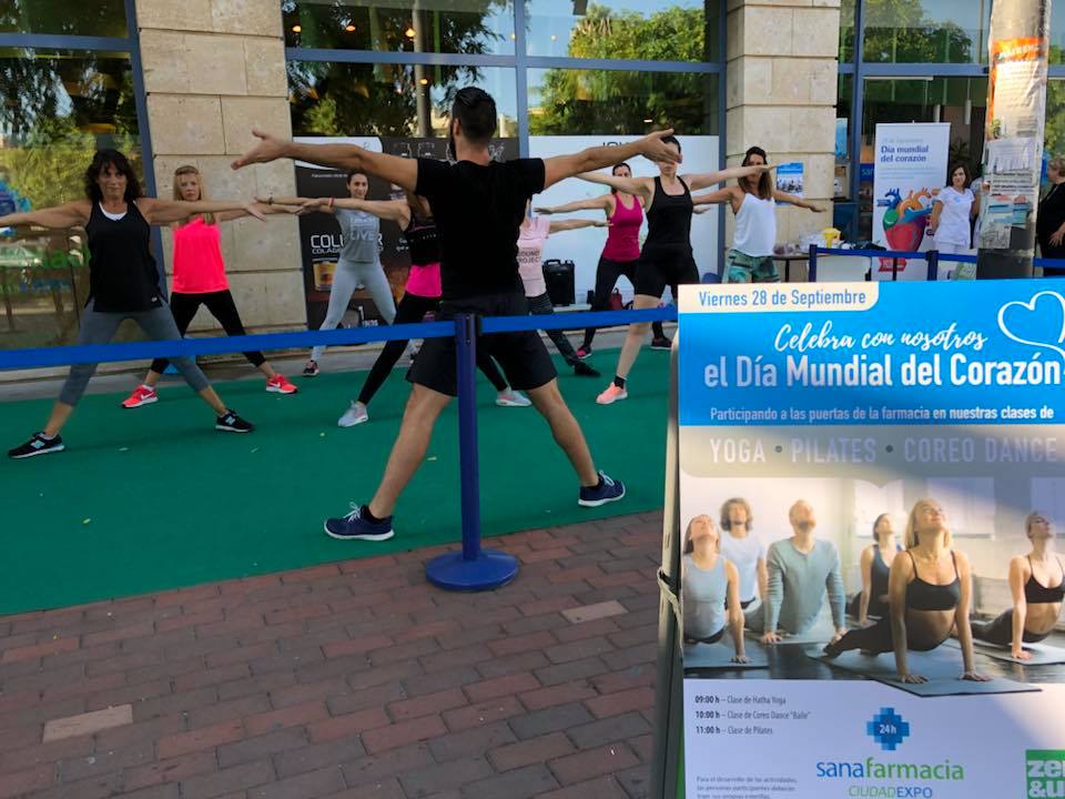 Sevilla, 28 de septiembre de 2018. Sanafarmacia Ciudad Expo, farmacia de 24 horas del Aljarafe, ha acogido esta mañana, con la colaboración del centro deportivo Zen&Up, diversas actividades deportivas al aire libre, con sesiones de Hatha Yoga, Pilates y Coreo Dance. Con esta actividad, se persigue reivindicar la importancia del ejercicio físico para mantener la salud del corazón, en el contexto del Día Mundial del Corazón, que se celebra mañana, 29 de septiembre. Asimismo, se han realizado mediciones de glucemia y de tensión arterial gratuitas, y se ha distribuido un Decálogo para la Prevencion de la Enfermedad Cardiovascular.