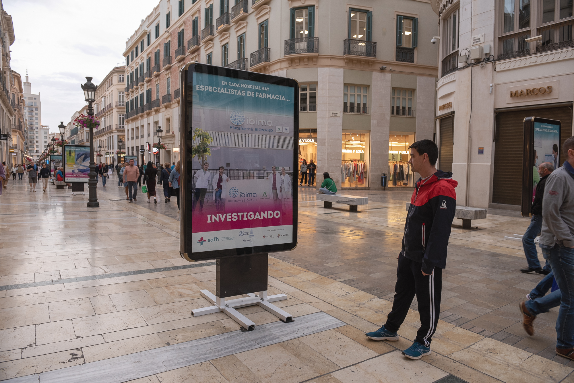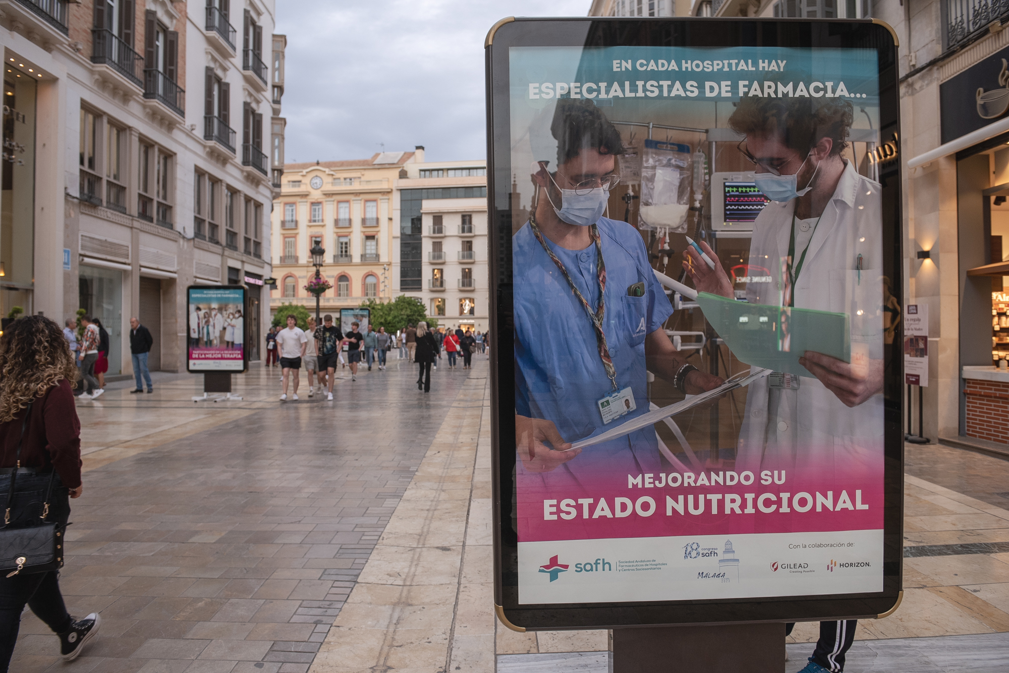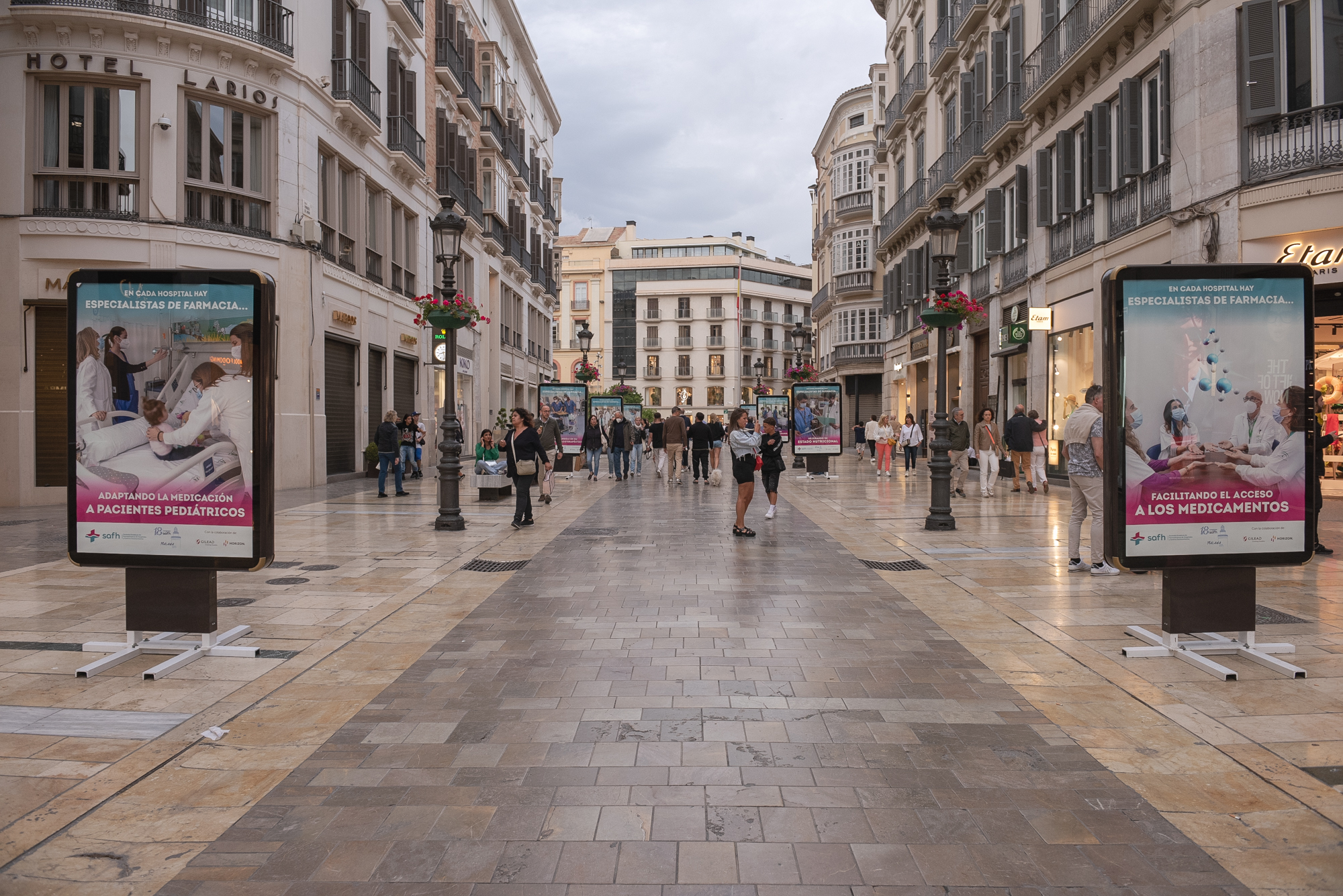 Málaga, 20 de abril de 2023.- La calle Marqués de Larios, en pleno centro de Málaga, acoge durante toda esta semana una exposición fotográfica en la que se muestra y pone en valor la actividad que desarrollan los profesionales de los servicios de Farmacia Hospitalaria de Málaga y Andalucía, con el fin de acercarnos a la ciudadanía y dar a conocer el importante papel que juegan en la atención y mejora de la salud de los pacientes, y dentro del sistema sanitario público.