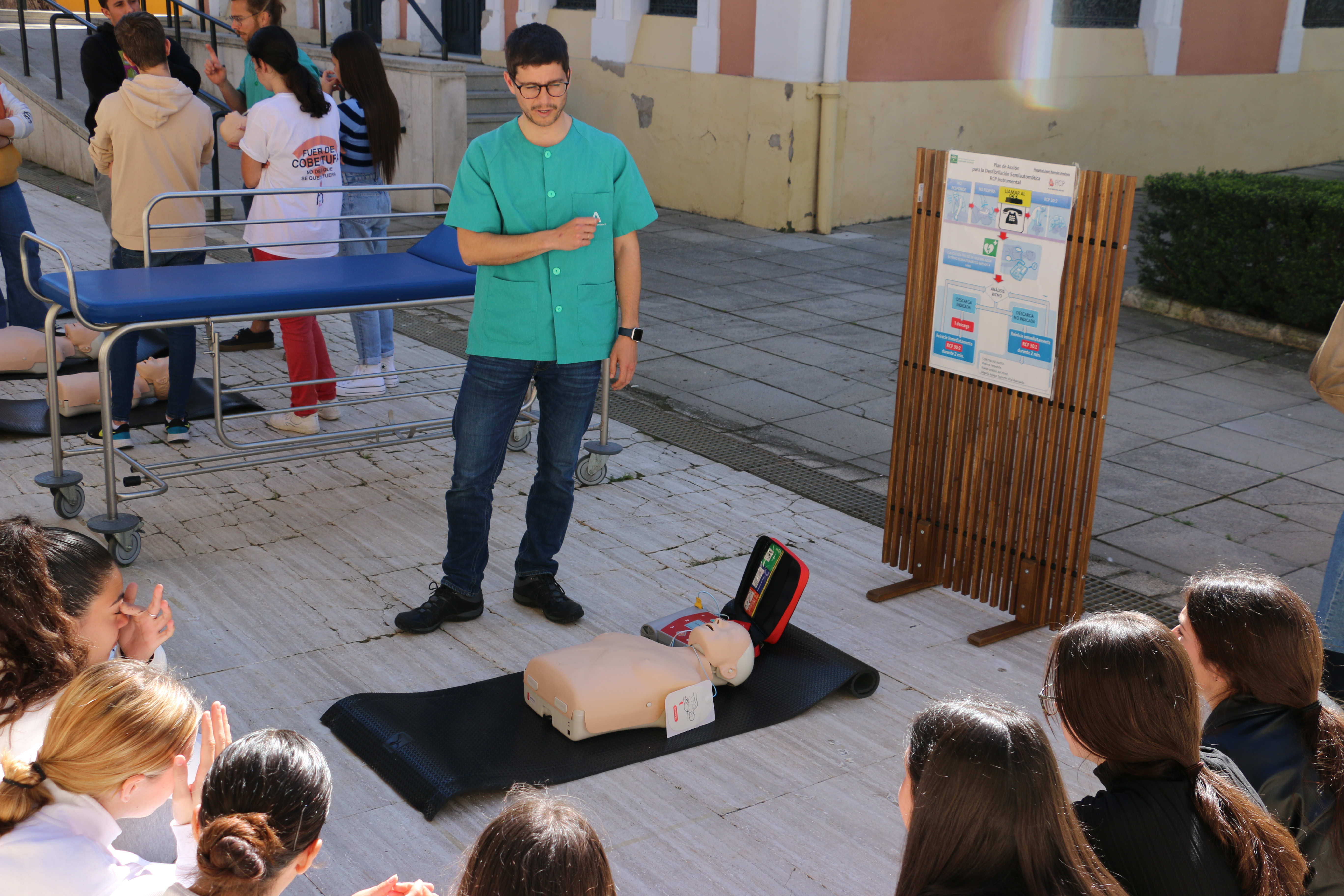 En la imagen: Carlos Jiménez, Director del Plan RCP del H.U Juan Ramón Jiménez, enseña a alumnos de un instituto de Huelva cómo realizar maniobras básicas de reanimación cardiopulmonar.