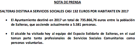 SALTERAS DESTINA A SERVICIOS SOCIALES CASI 132 EUROS POR HABITANTE EN 2017