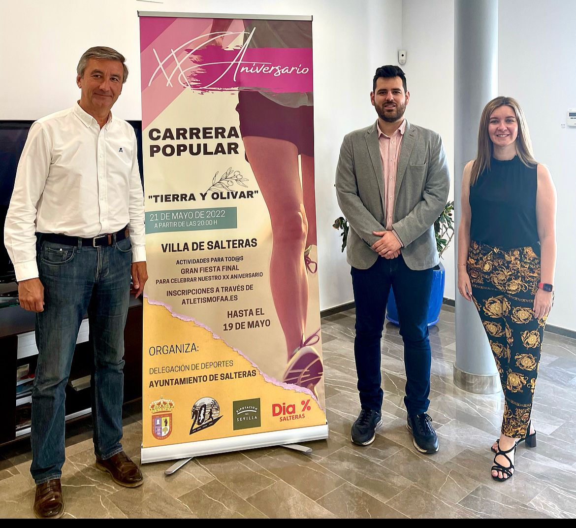Salteras 13 de mayo Esta mañana ha tenido lugar la presentación en el ayuntamiento de la vigésima edición de la carrera popular “Tierra y Olivar” en la que se darán cita hasta 800 corredores. Este año además como gran novedad, se celebrará en horario de tarde, a partir de las 20 horas. Al acto han acudido el alcalde de Salteras Antonio Valverde Macías y el diputado provincial de Cultura y Ciudadanía de la Diputación de Sevilla, Alejandro Moyano.