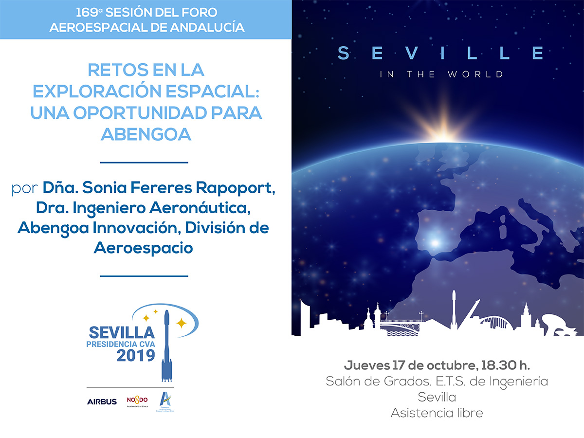 Sevilla 15 de octubre Dentro del marco de actividades programadas en este año 2019 para celebrar que Sevilla ostenta la Presidencia de la Comunidad de Ciudades Ariane se encuentra la 169ª edición del Foro Aeroespacial de Andalucía, actividad coordinada por Carlos Gómez Camacho, catedrático de Termodinámica de la Escuela Técnica Superior de Ingeniería de la Universidad de Sevilla y que contará en esta ocasión con la presencia de la dra. Ingeniera Aeronáutica Sonia Fereres Rapoport quien analizará a lo largo de la tarde del jueves los “Retos en la exploración espacial: una oportunidad para Abengoa”. En esta conferencia la Dra. Fereres explicará como “50 años después de las misiones Apolo, hay un esfuerzo global por regresar a la Luna. Se están desarrollando distintas tecnologías que aprovechen los recursos lunares para producir consumibles (agua, oxígeno) y energía para futuras bases en la Luna. Abengoa, como empresa dedicada al desarrollo de tecnología en entornos exigentes, puede contribuir con su experiencia a estas iniciativas. Se presentarán algunos de estos proyectos y sus peculiaridades.” La conferencia tendrá lugar a las a las 18:30 en el de Grados de la E.T.S.