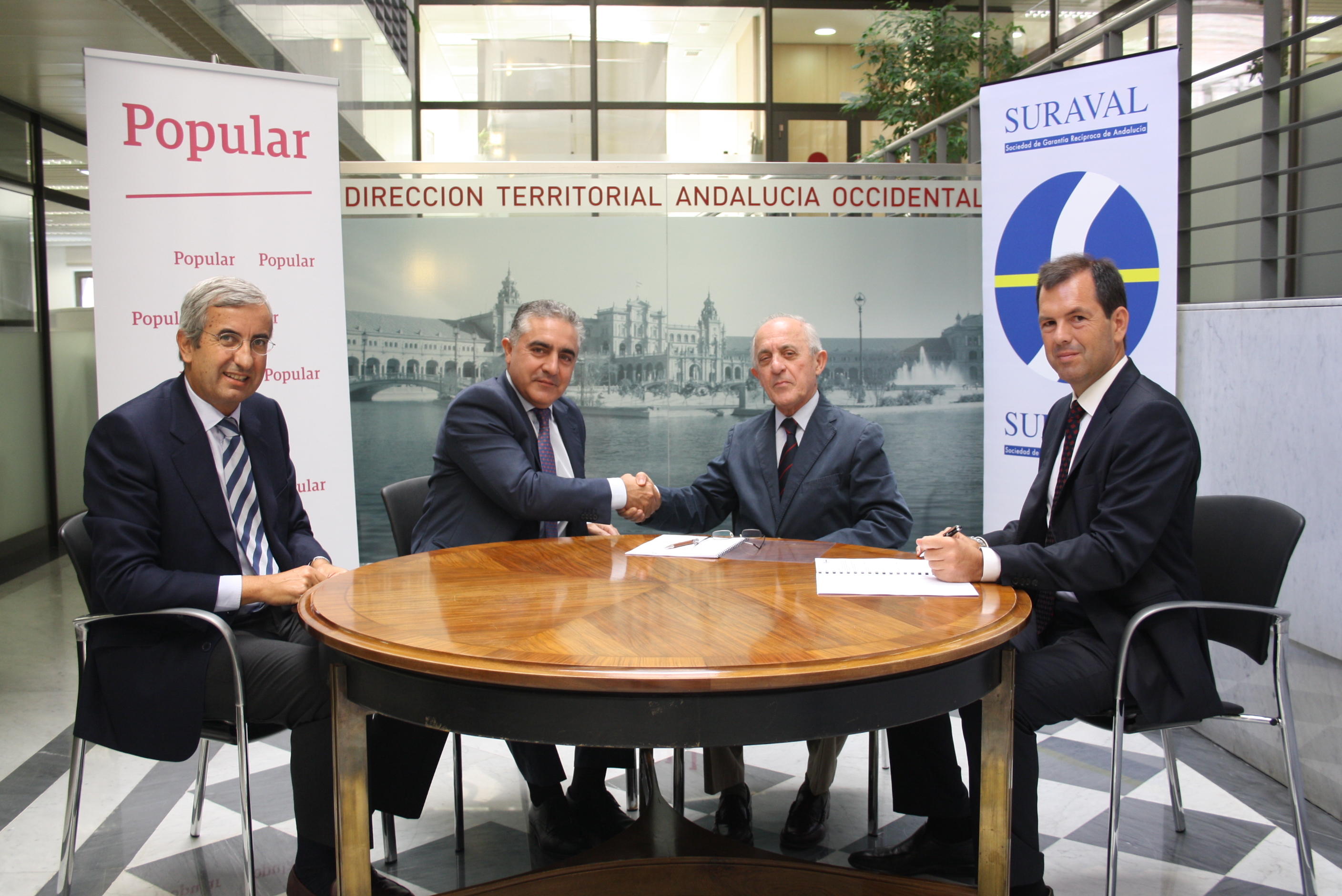 El acuerdo ha sido firmado hoy por el consejero delegado y el director comercial de Suraval, Pablo Millán e Ignacio Rodríguez, respectivamente; y por Luis Marín y Luis Miguel Pelayo, subdirector general y director territorial de Andalucía Occidental y director de Empresas de la Dirección Territorial Andalucía Occidental de Popular, respectivamente, quienes han coincidido en la importancia de estimular y favorecer el acceso al crédito de las pymes andaluzas para la reactivación económica y la recuperación de empleo en la comunidad andaluza en el actual contexto de crisis.