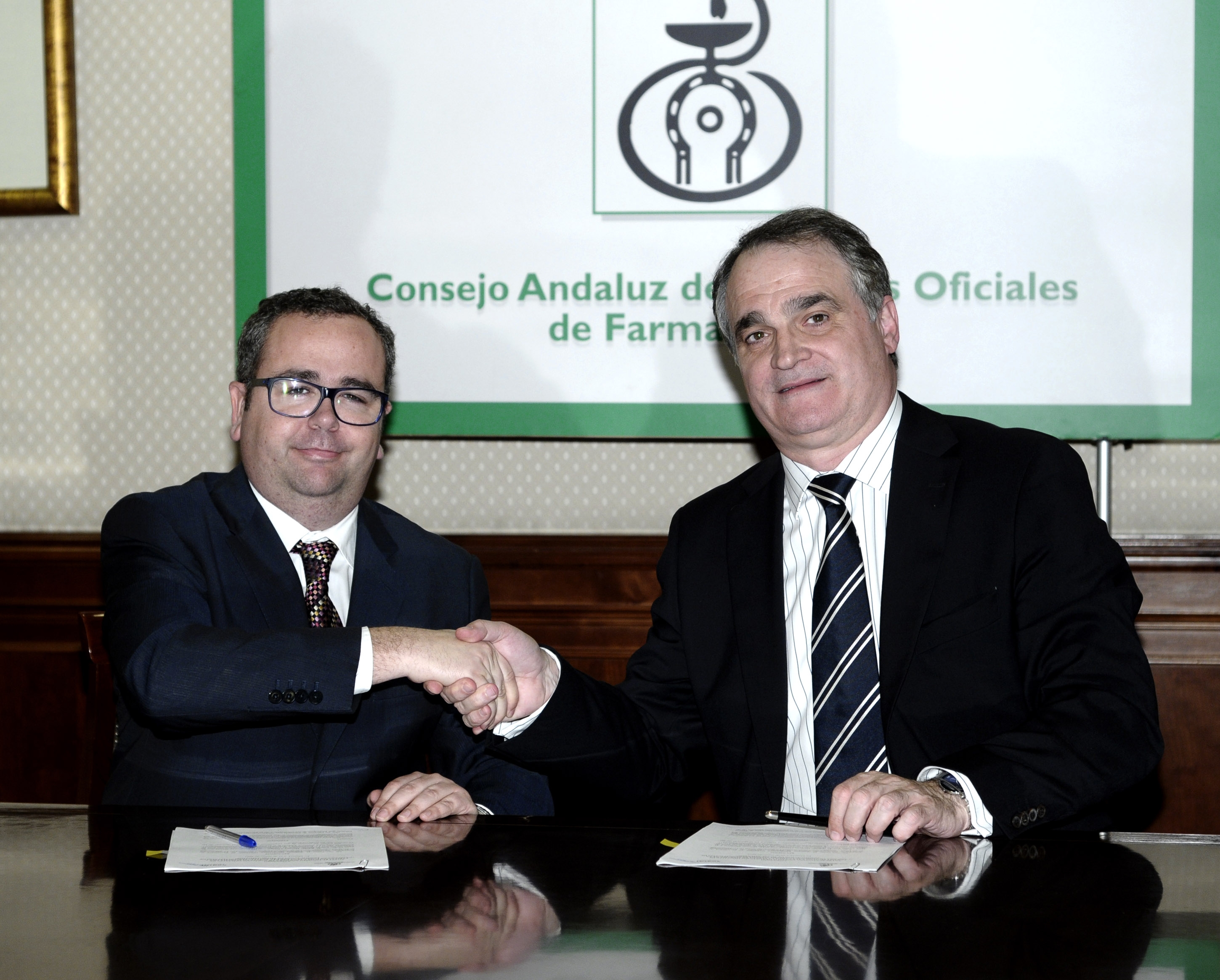 Pie de foto: El director comercial de TEVA, Juan Carlos Conde (izquierda) y el presidente del Consejo Andaluz, Antonio Mingorance suscriben el acuerdo de colaboración entre TEVA y el Consejo Andaluz de Colegios Oficiales de Farmacéuticos.