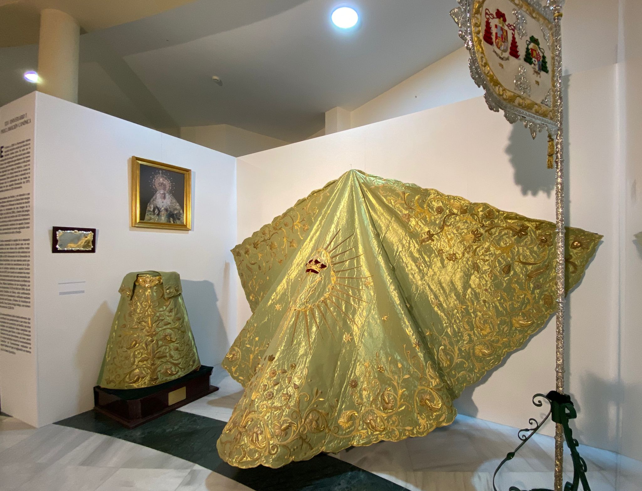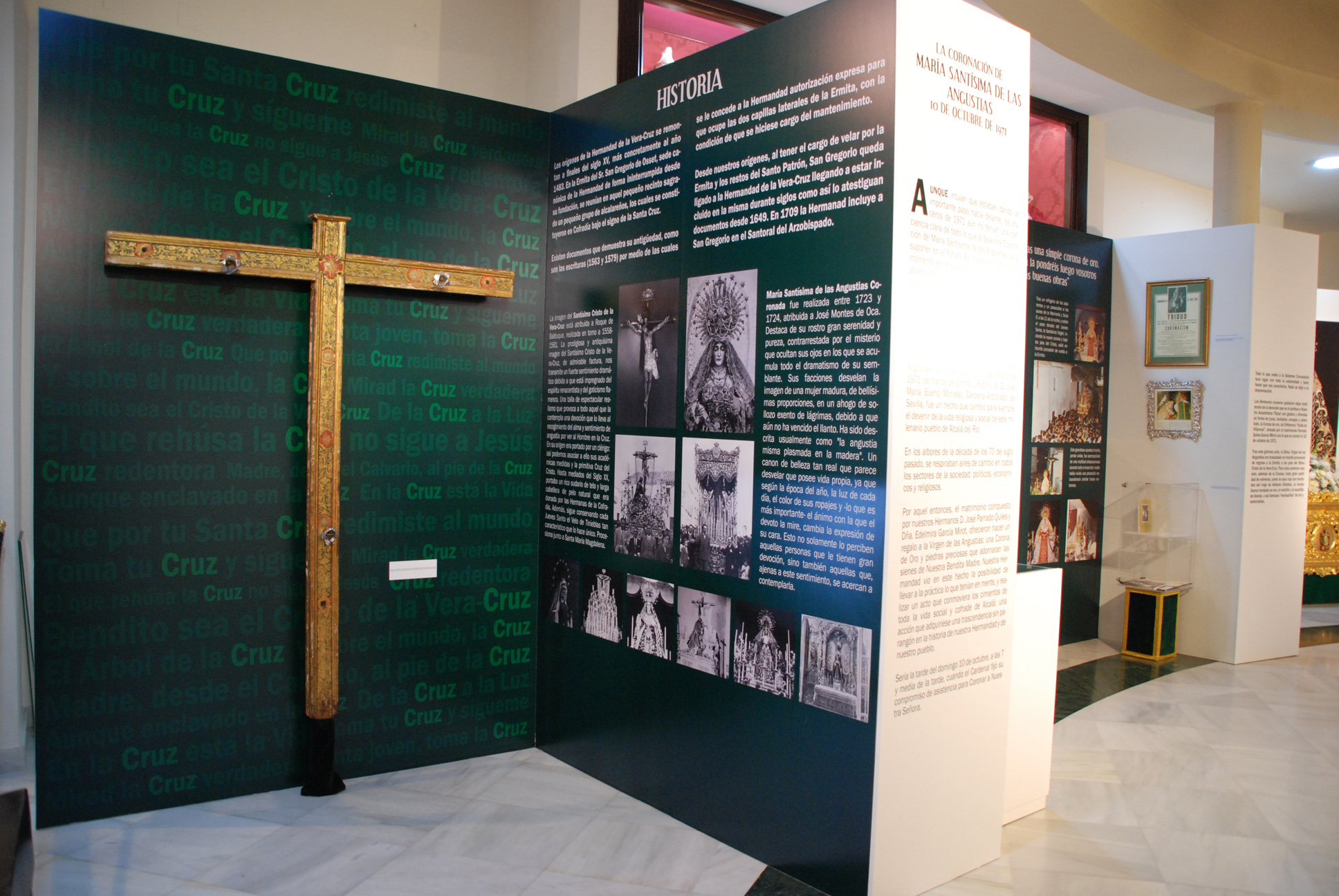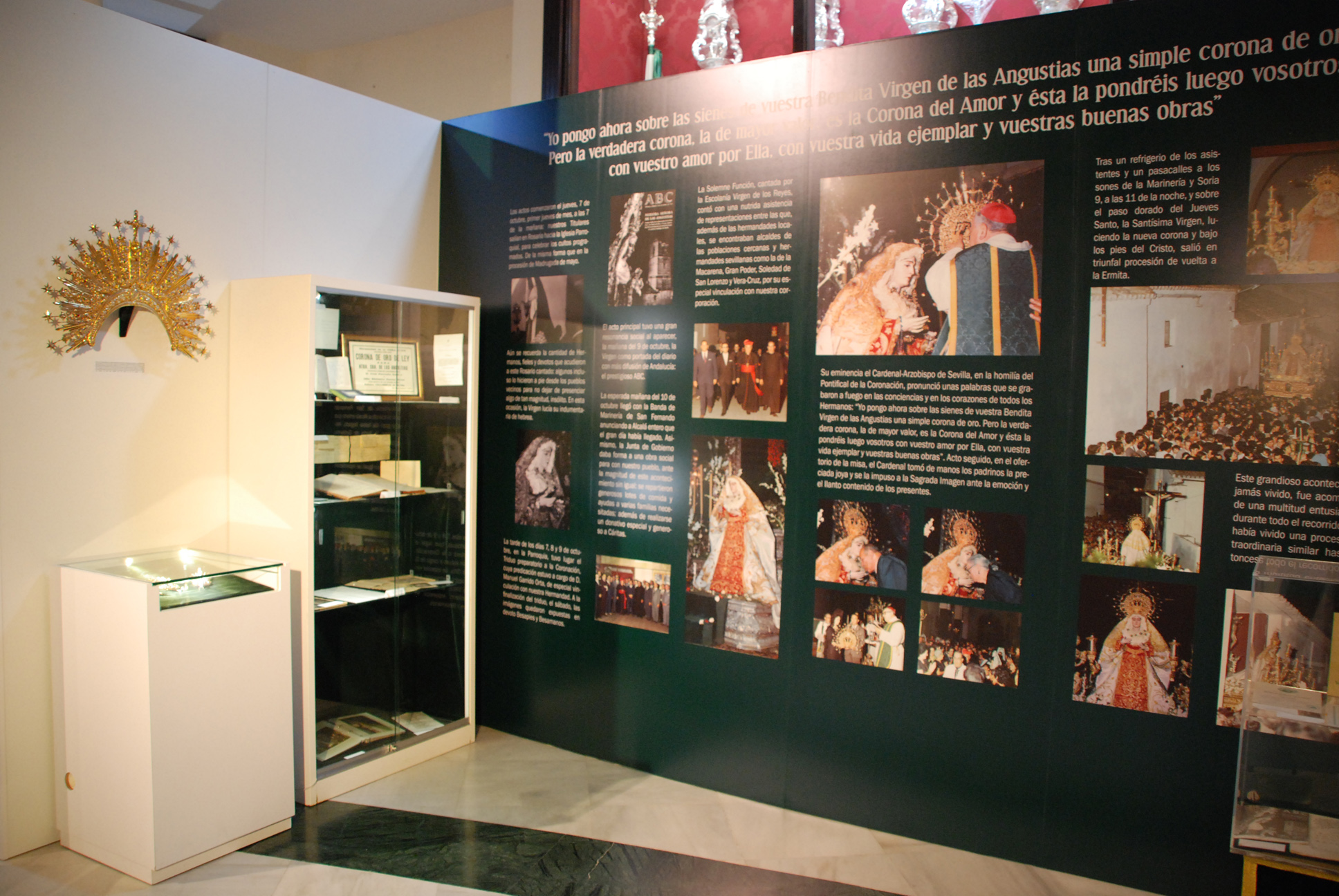En un recorrido cronológico a través de la exposición, el visitante podrá conocer los orígenes de la Hermandad, con enseres como la primitiva Cruz del Santísimo Cristo del Siglo XV; o el acontecimiento de la Coronación de la Virgen de las Angustias, con imágenes inéditas y piezas de gran valor artístico, como la saya bordada por el taller de Esperanza Elena Caro, una recreación del altar de la Coronación con el dosel de Villarreal y las gradas de Fernando Marmolejo o la propia Corona de oro con la que fue Coronada María Santísima de las Angustias, que se ubica en el centro de la muestra.