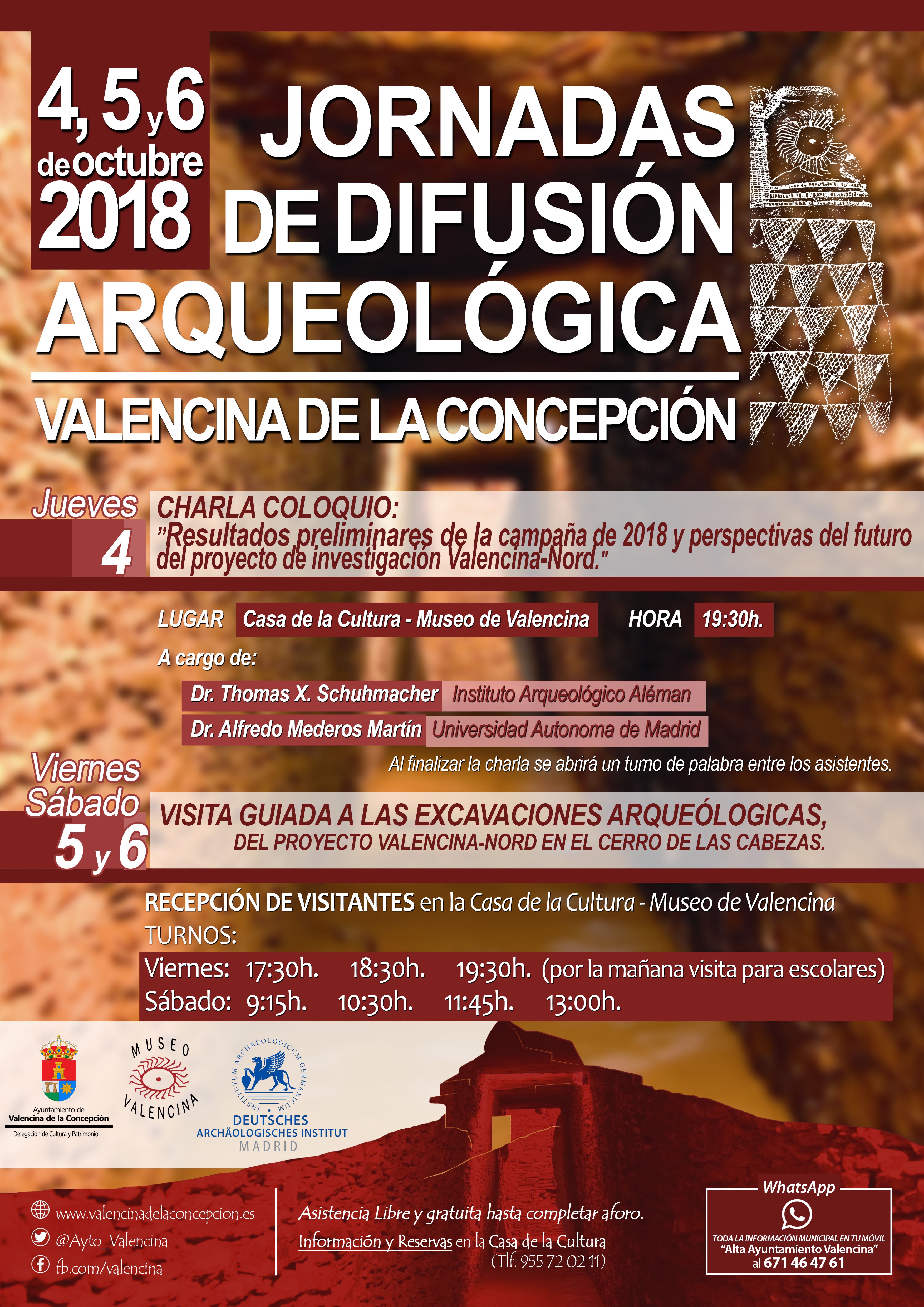 Valencina de la Concepción, 27 de septiembre de 2018.- El Ayuntamiento de Valencina, por medio de su delegación de Patrimonio, y el Instituto Arqueológico Alemán, organizan de forma conjunta una nueva edición de las Jornadas de Difusión Arqueológica Valencina de la Concepción. Tras el anterior encuentro celebrado en marzo, en la presente convocatoria se incluyen dos actividades: